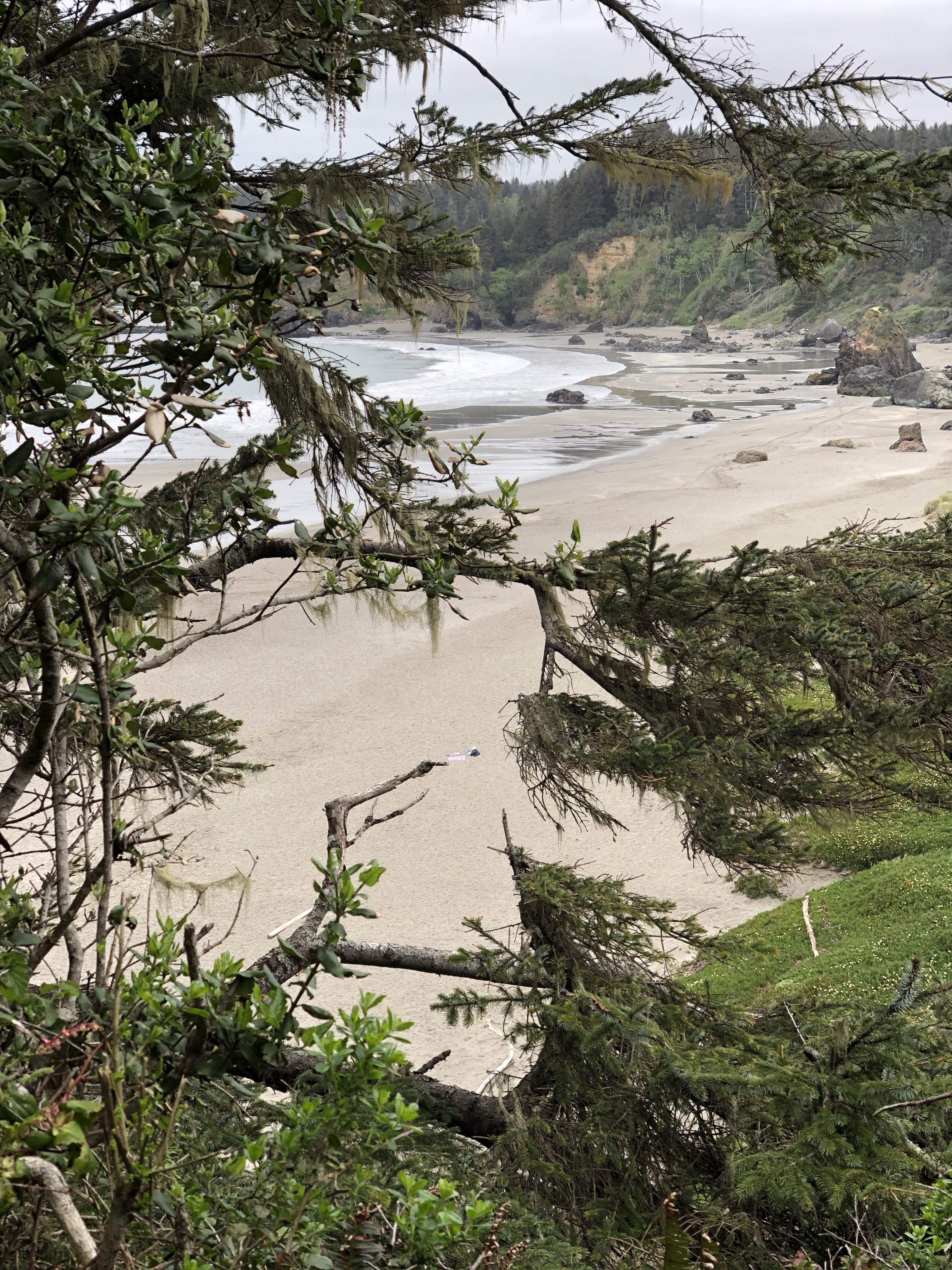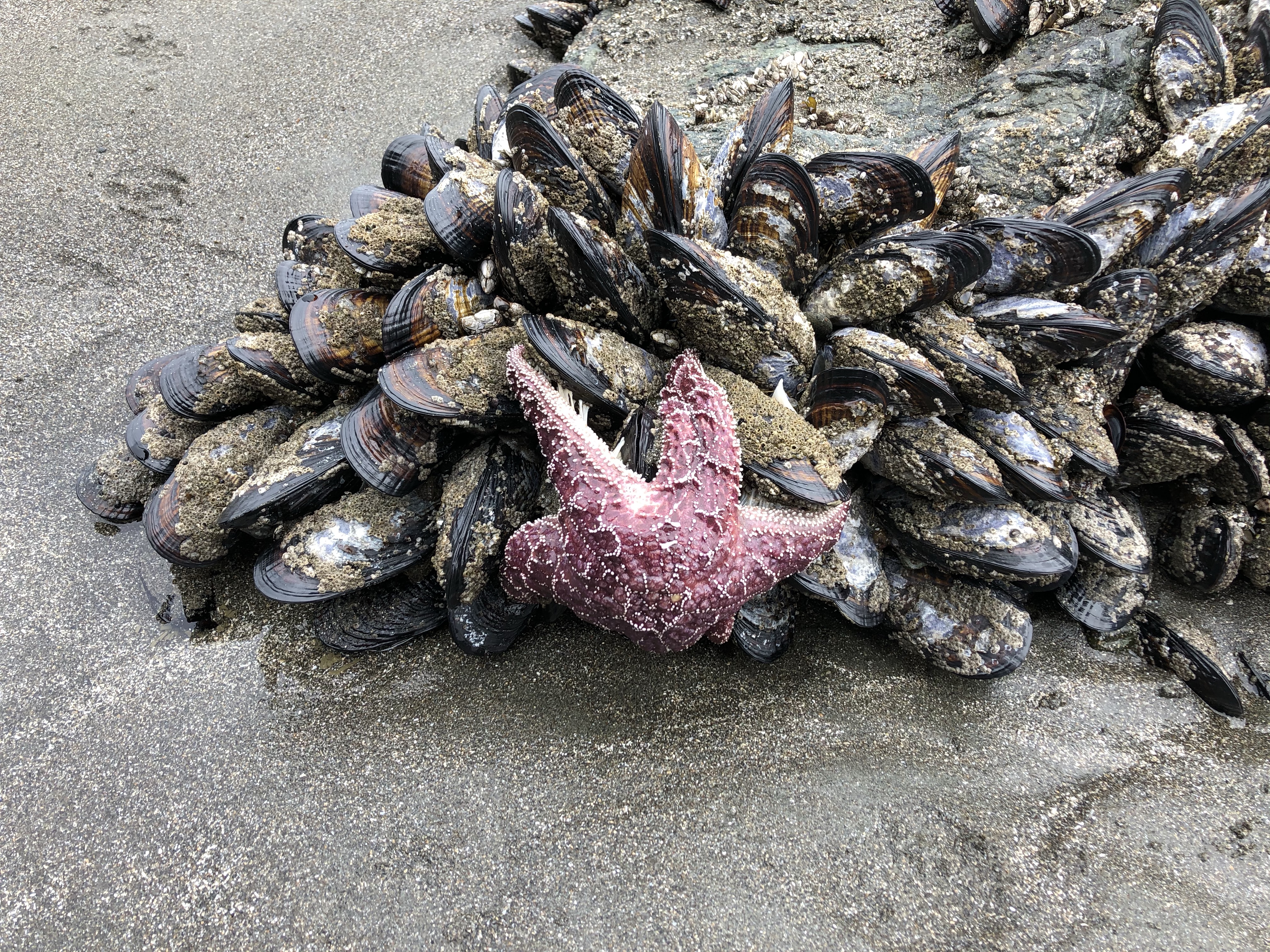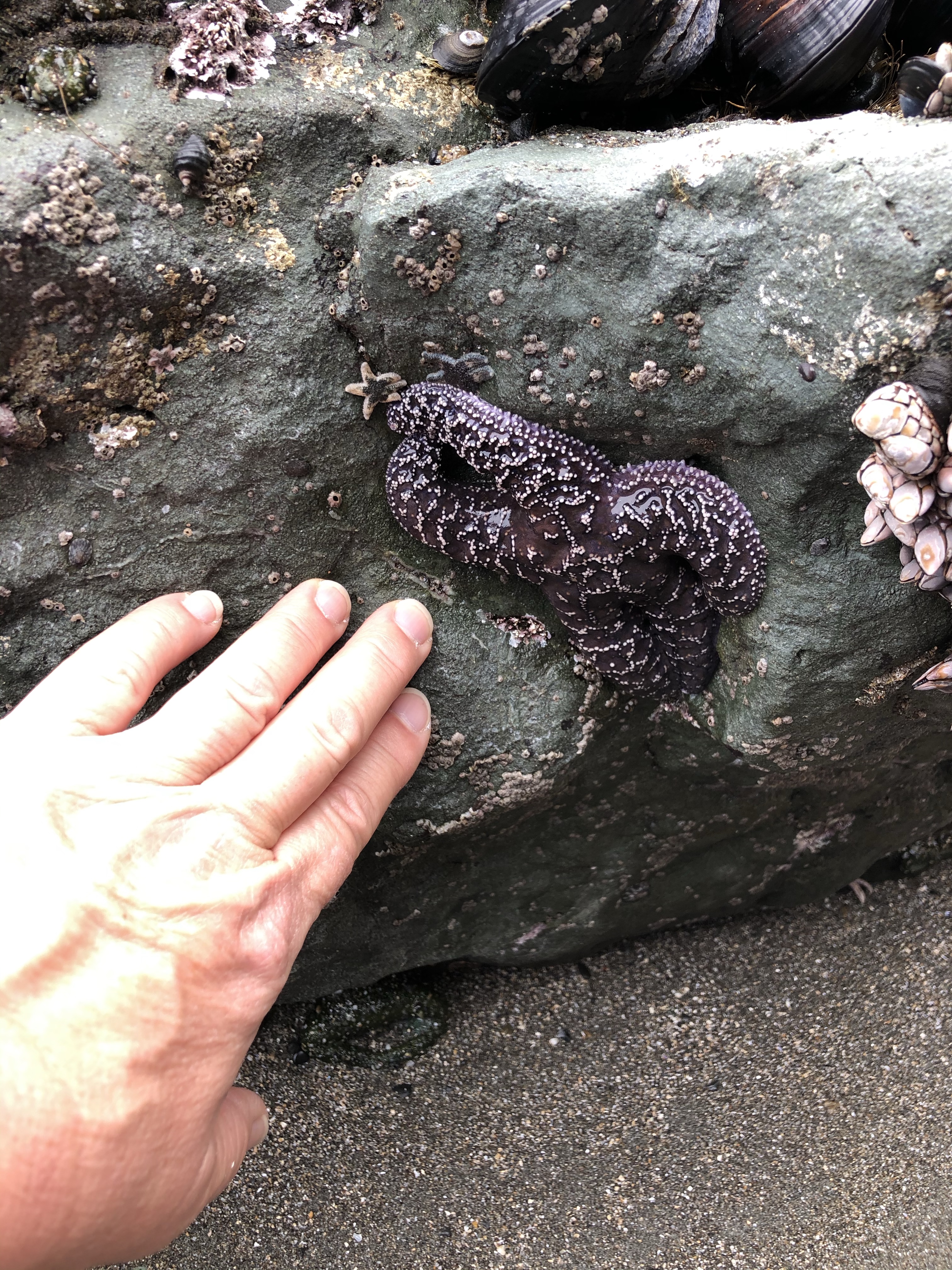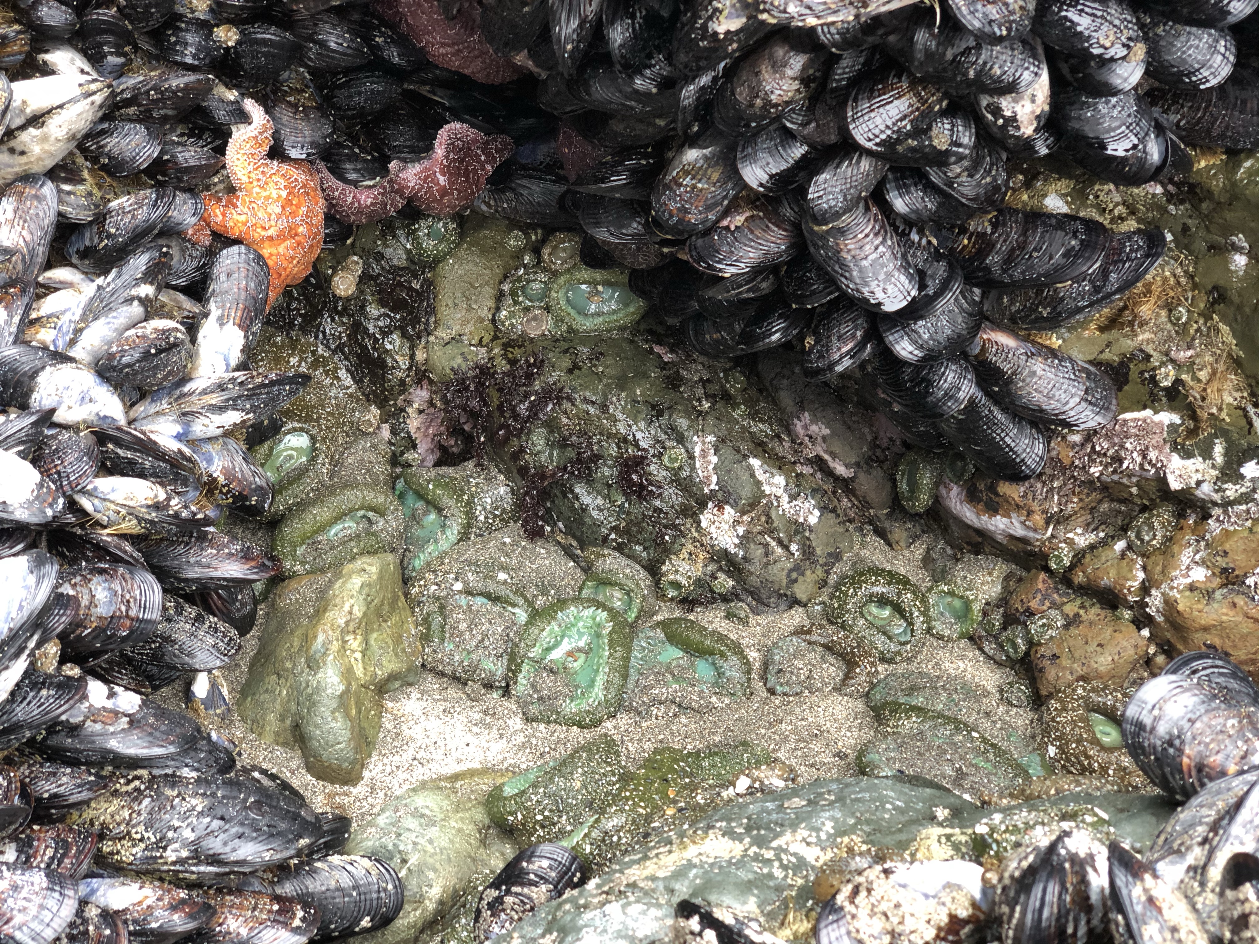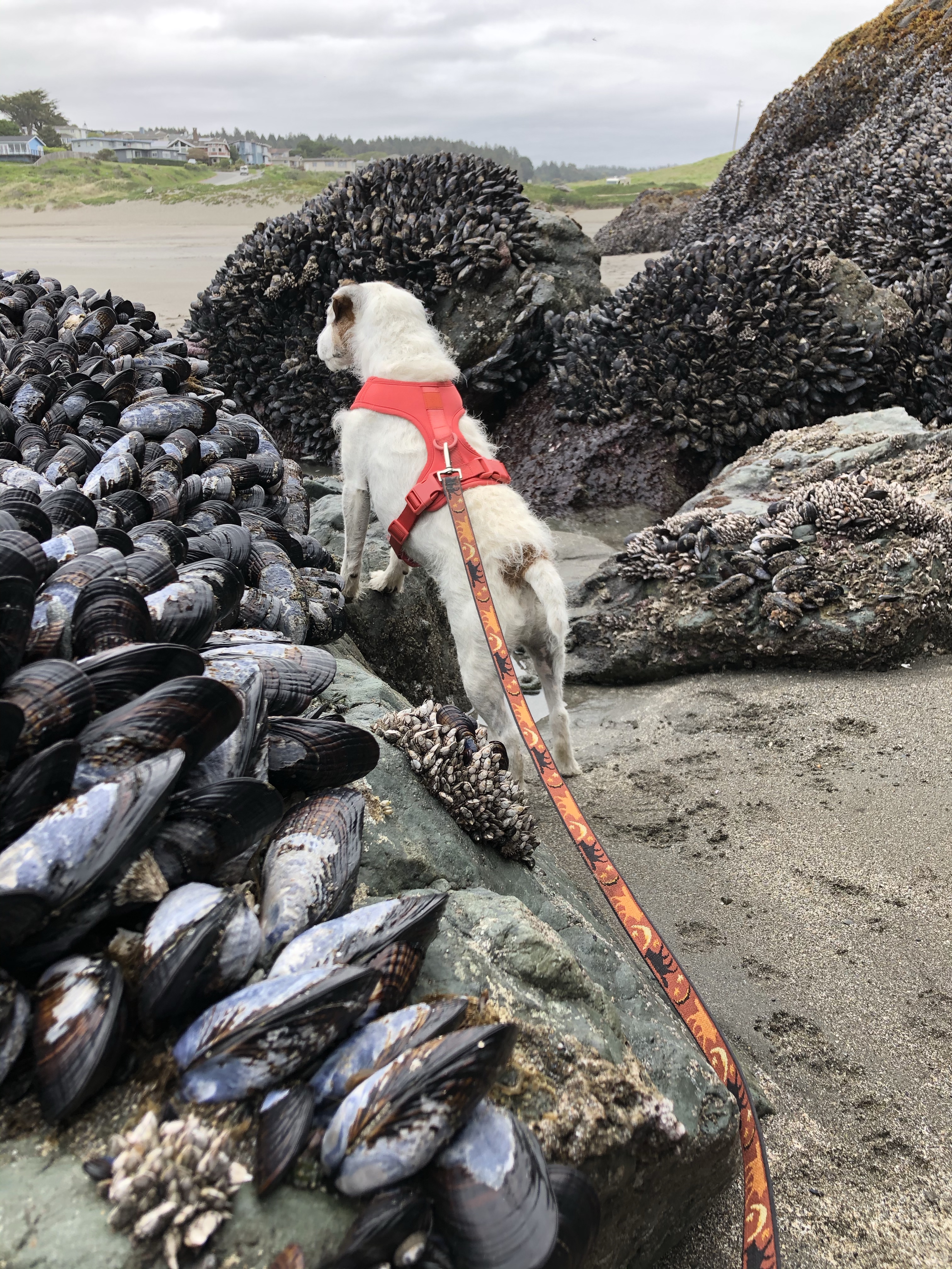 It was a quiet morning in the neighborhood, on the headland and the beach. The kind of morning I relish and hope for. The ocean was very flat; a great morning for kayaking. As we circled the headland, a single CA sea lion could be heard barking on the southern end. A few Canada geese and some songbirds were around but otherwise very quiet on the north side. The beach was wide open. The morning “dog park” group had already come and gone so Baxter and I walked down to check out the intertidal exposed by today’s low tide. A great start to our week.