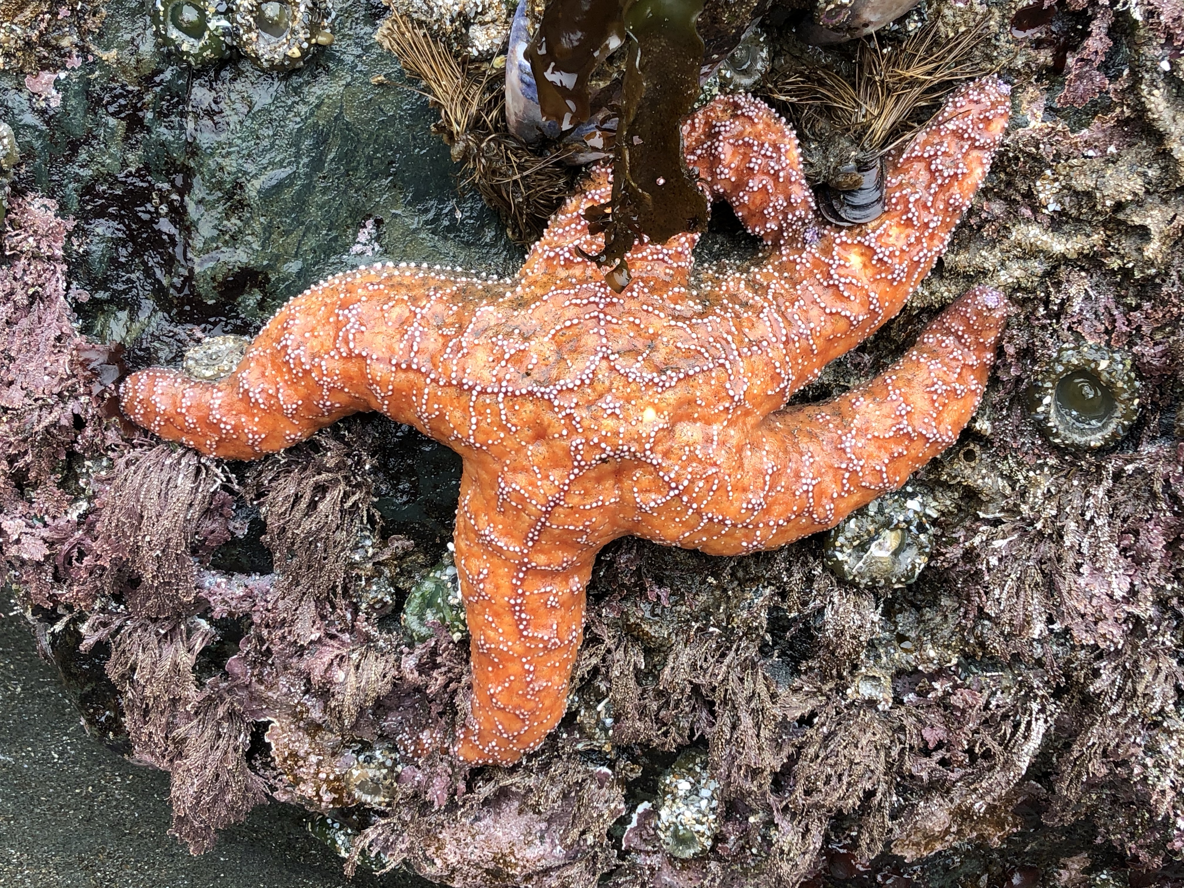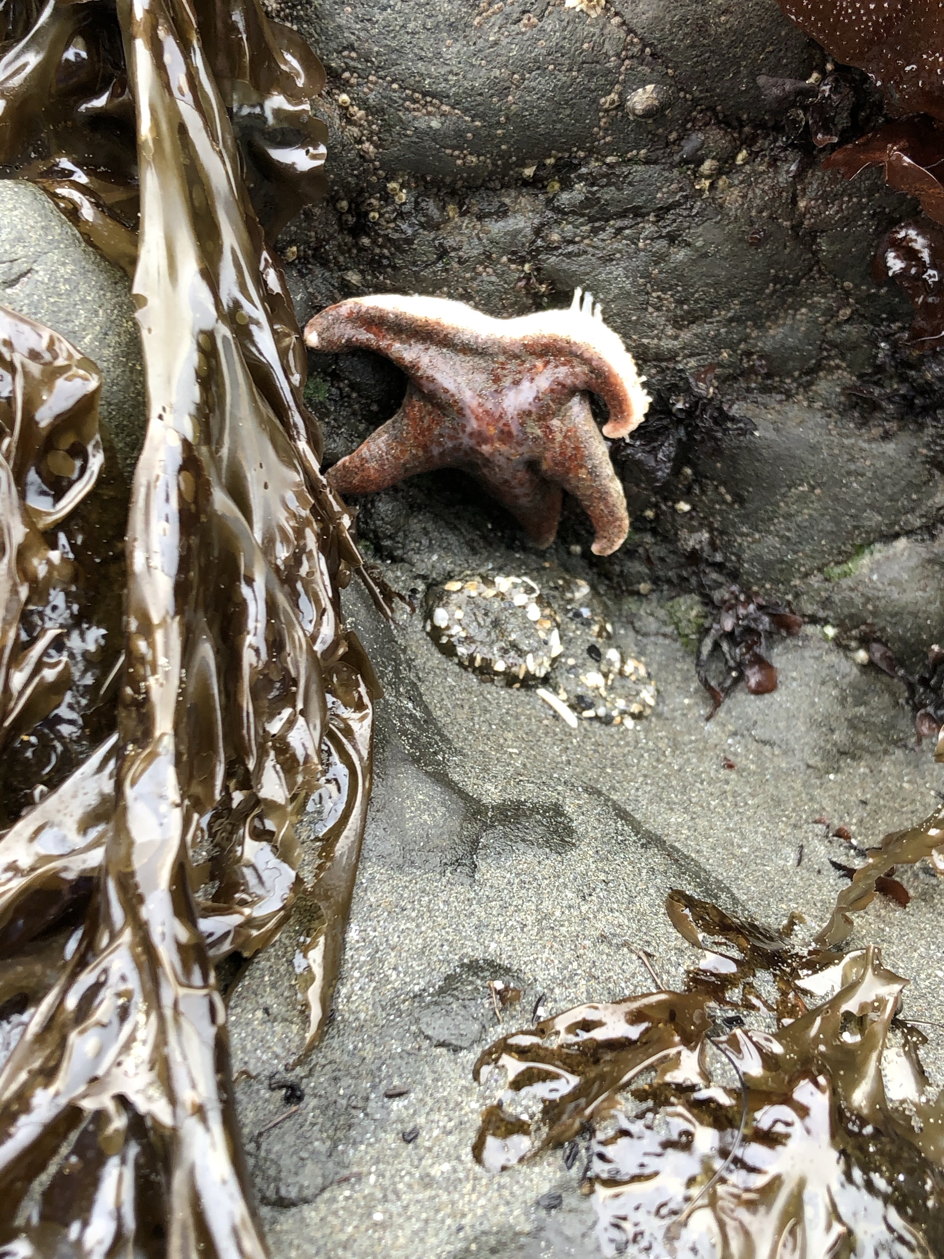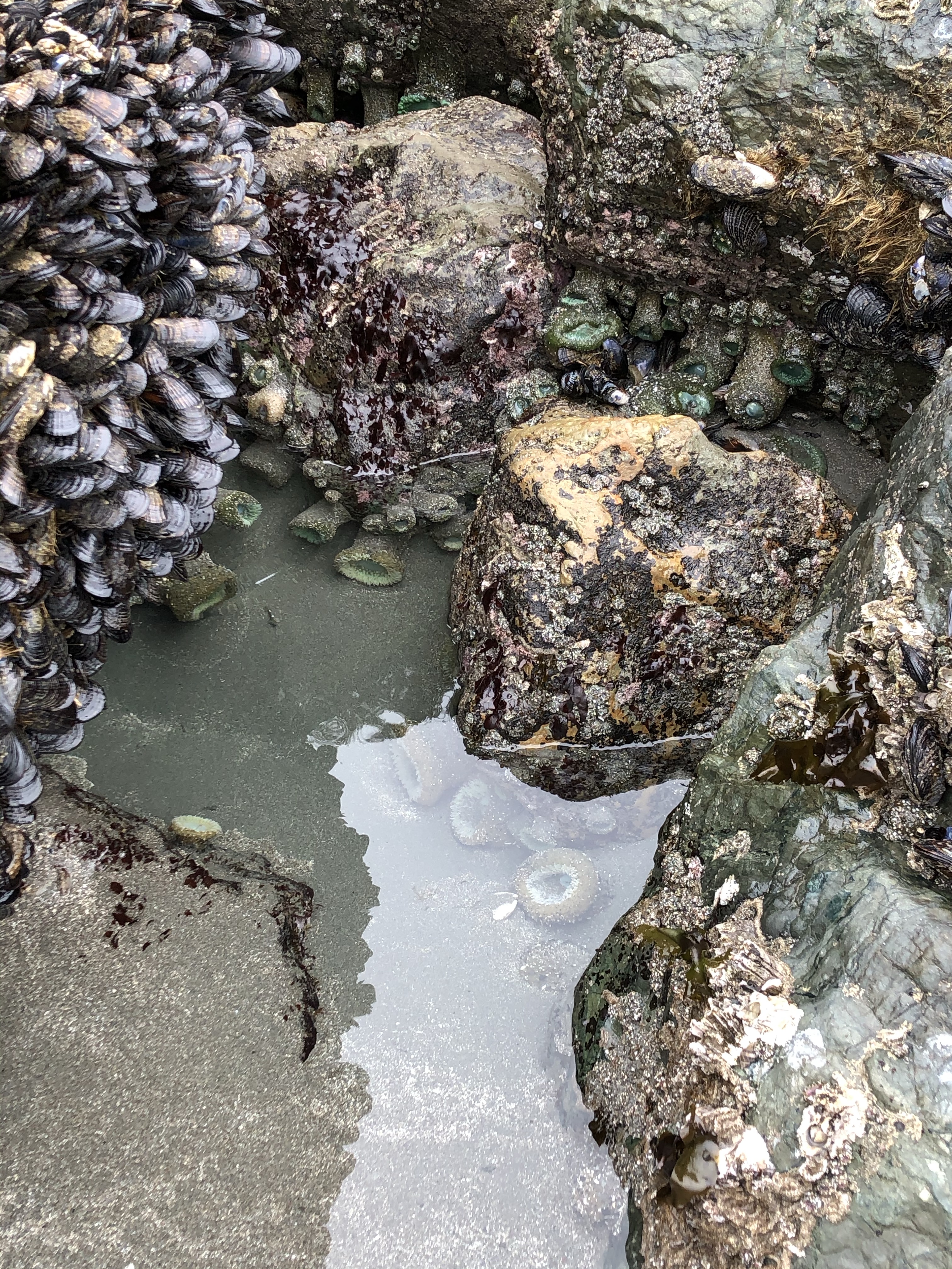This morning’s walk triggered fond memories as I was standing on the edge of a boulder field listening to the waves crash against the cliffs and intertidal boulders. My mind flashed back to the special times out in the field on remote islands with my handsome marine biologist husband. In those days Brian was the Indiana Jones of the intertidal. Climbing up and down cliff faces, jumping over and into crevices and spearing fresh lingcod for dinner. What a way to romance a gal!