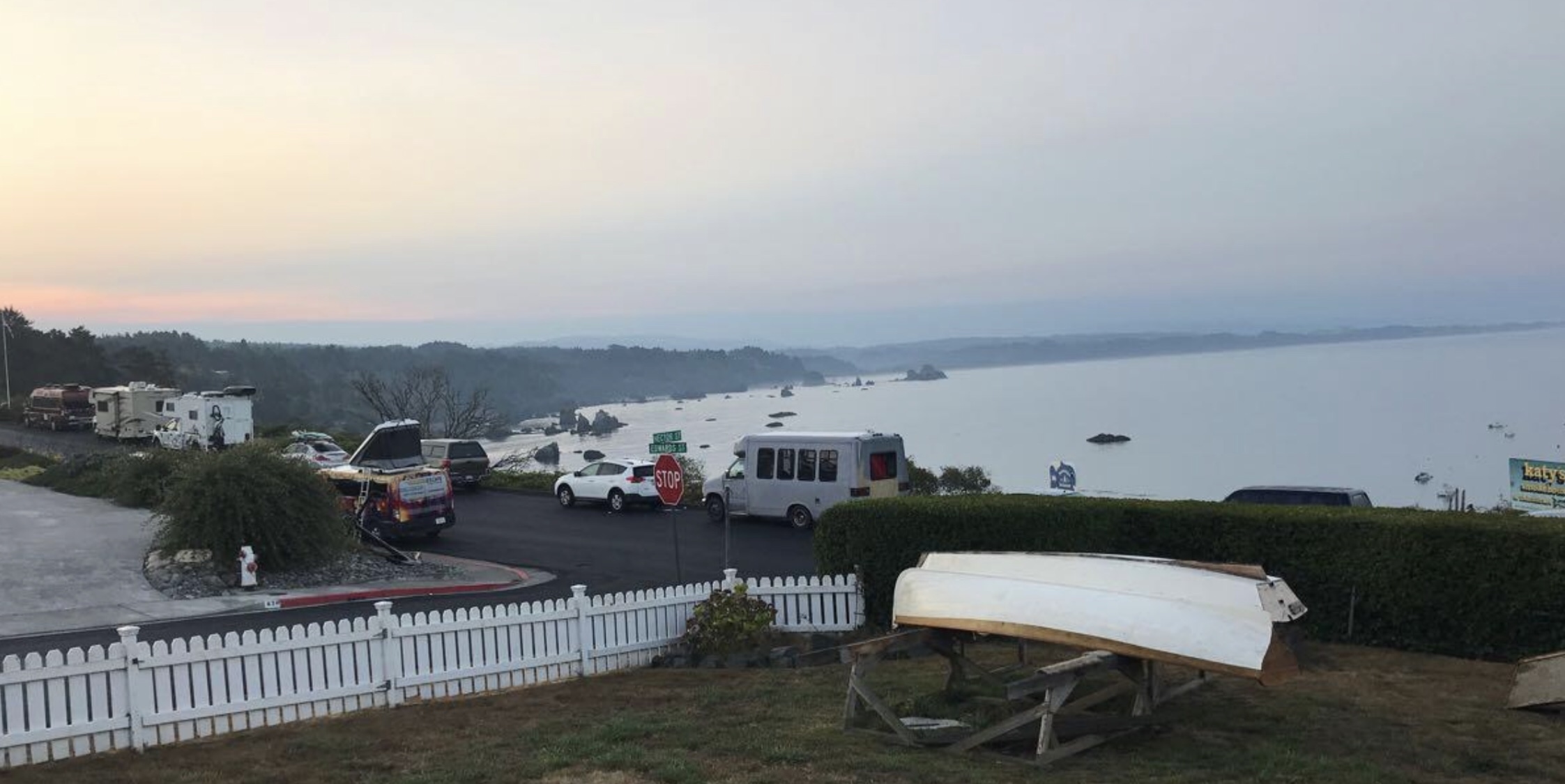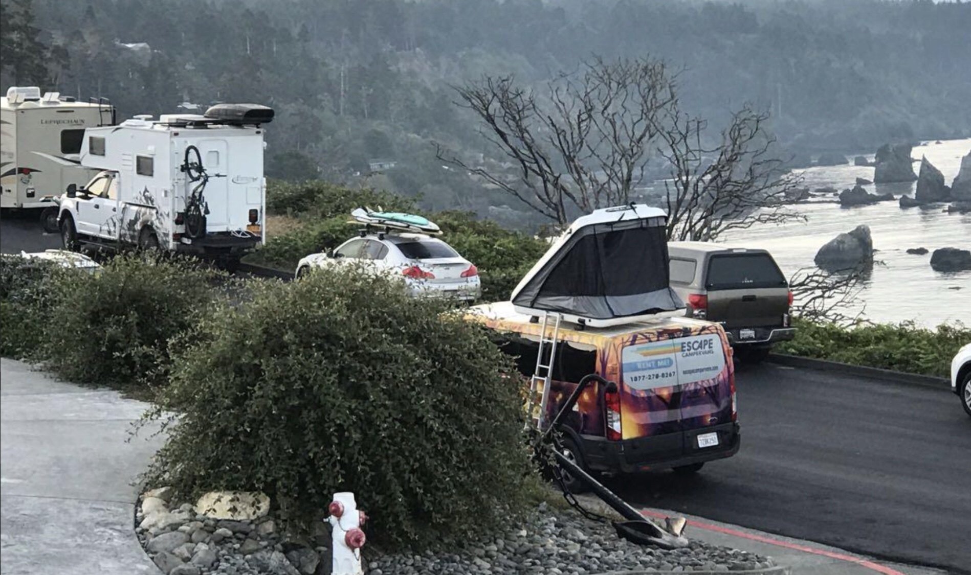 Saturday morning our neighbors who live along Edwards Street (the bay side of town with a stunning view) awoke at 6:30 am to witness a cluster of 13 camping rigs/vehicles who either came unprepared without a local campground reservation or just didn’t care and planned to sleep inside their rigs along the street. Our neighbors reported waking up to horns honking, traffic confusion, and urine running down the street. The City of Trinidad is small, with a reported 367 permanent residents. We are literally what I call “a spot in the road.” The City contracts with the Humboldt County Sheriff’s Office for part time law enforcement. Here are the pics our neighbor posted online Saturday morning.
