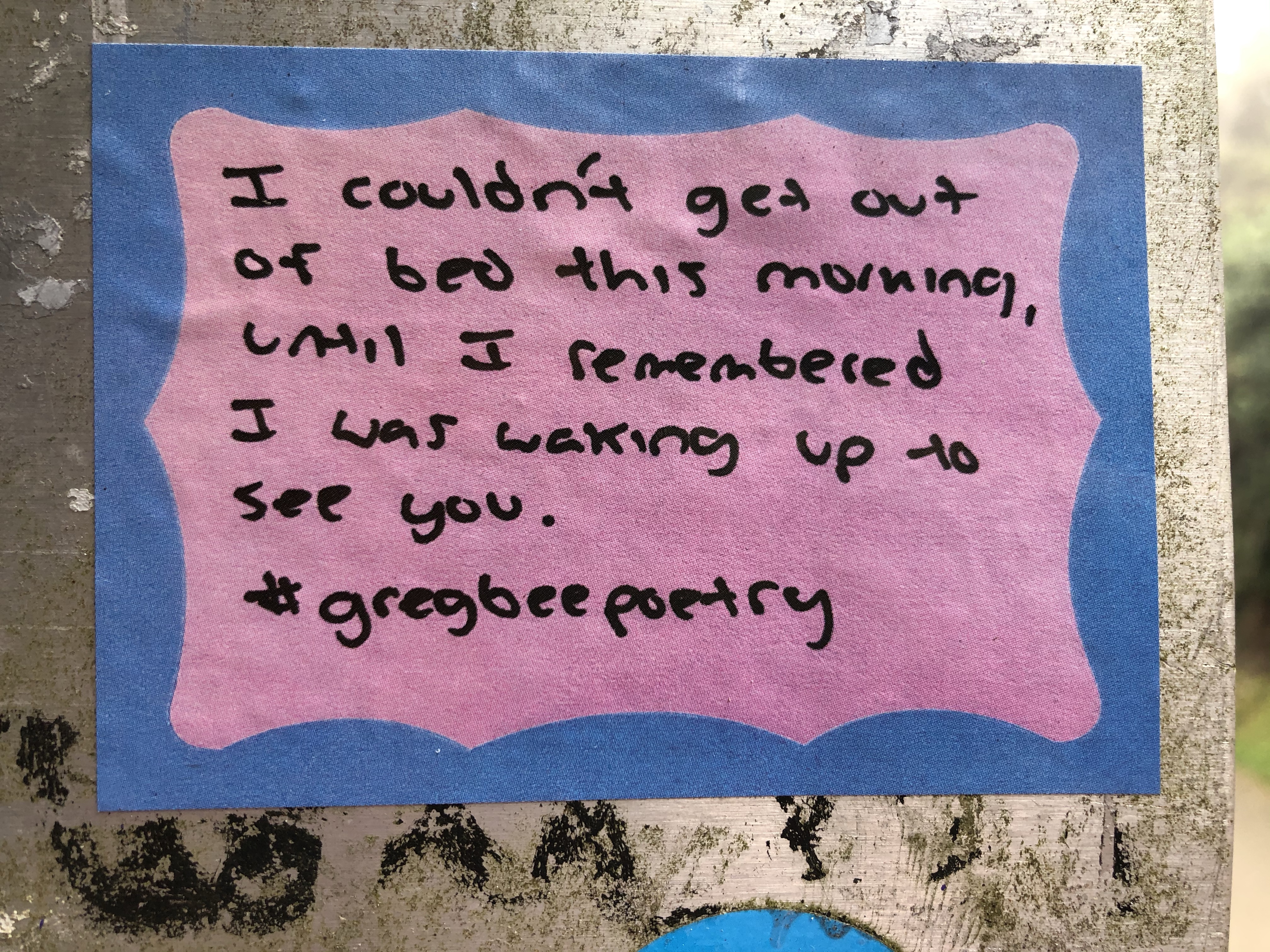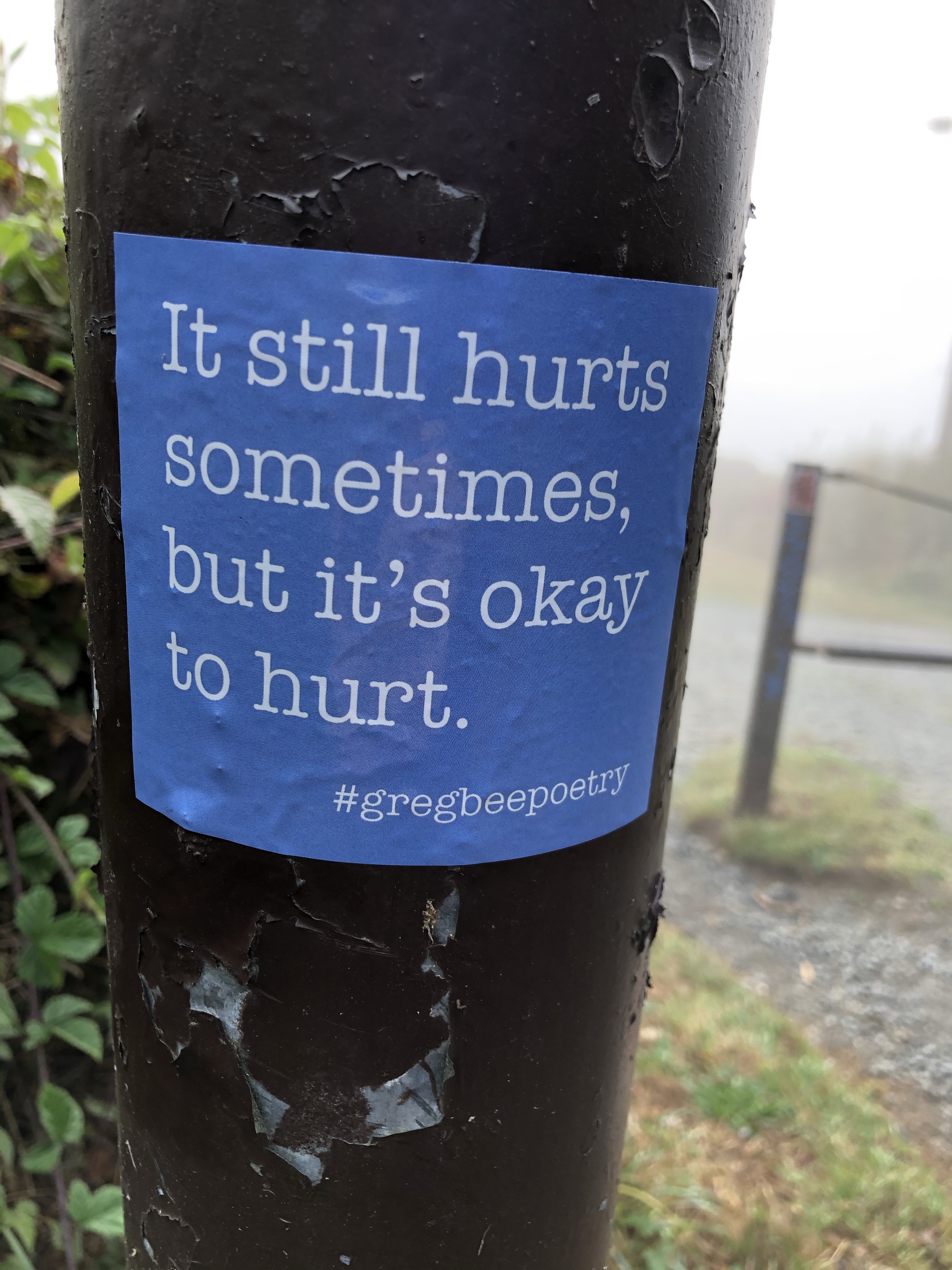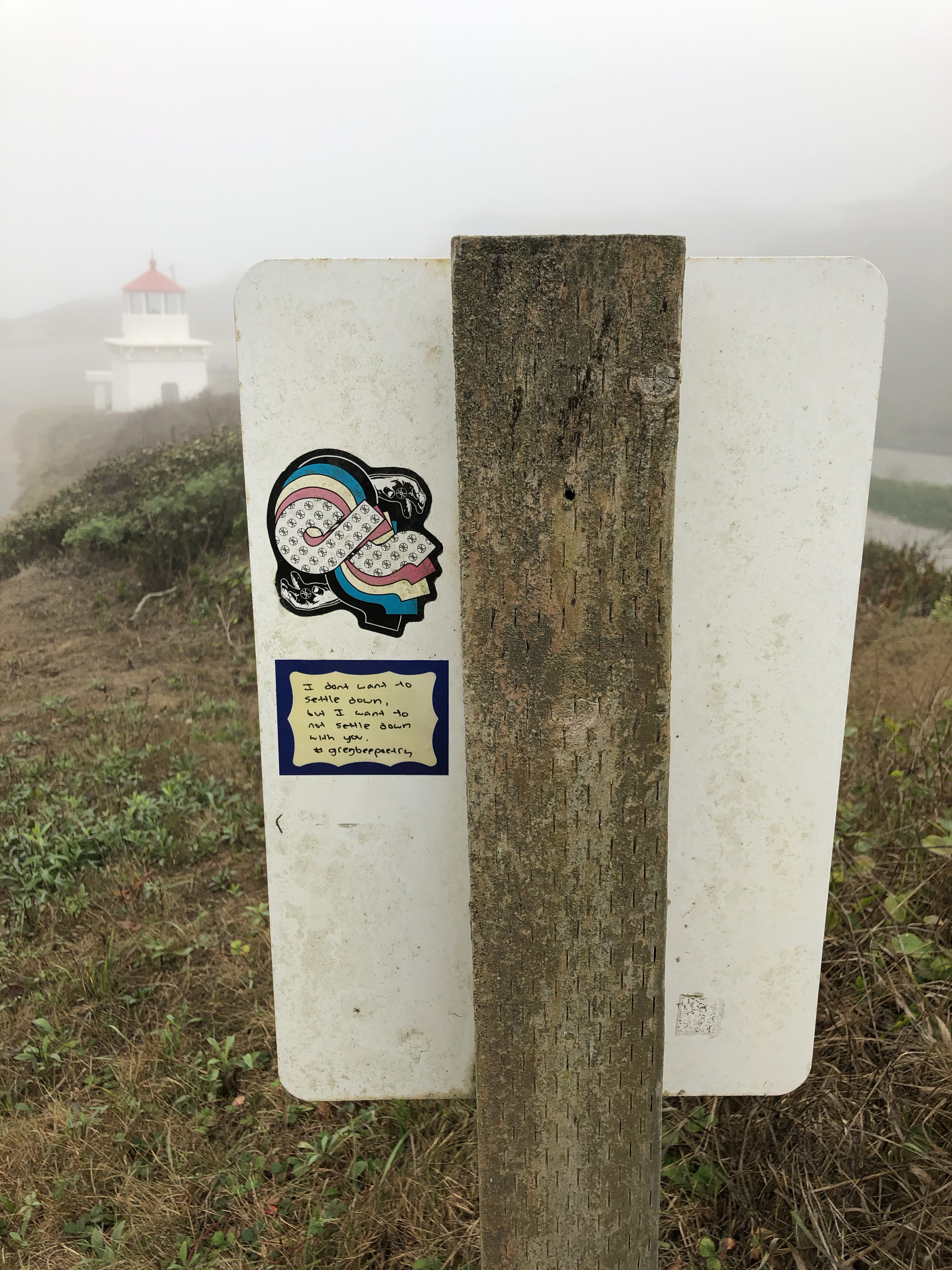 Poet Greg Bee’s work has been showing up on the headland for awhile, in the form of stickers posted on to metal posts and signage. According to his website: Bee is a traveling poet, storyteller and motivational speaker based in Eureka, CA, where he is a registered nurse, mental health advocate and community activist. His work deals with gender and sexuality, as well as social and political issues.