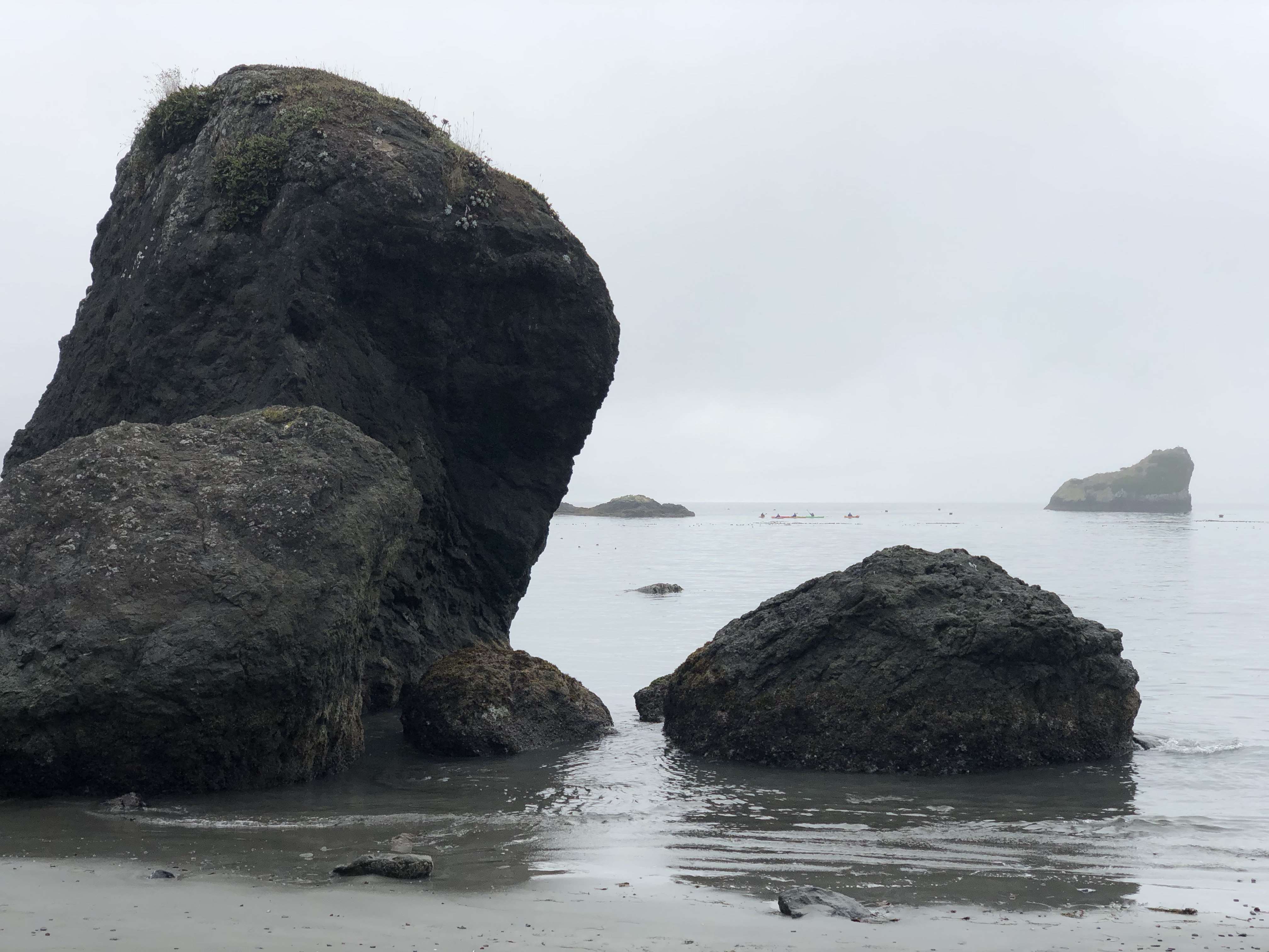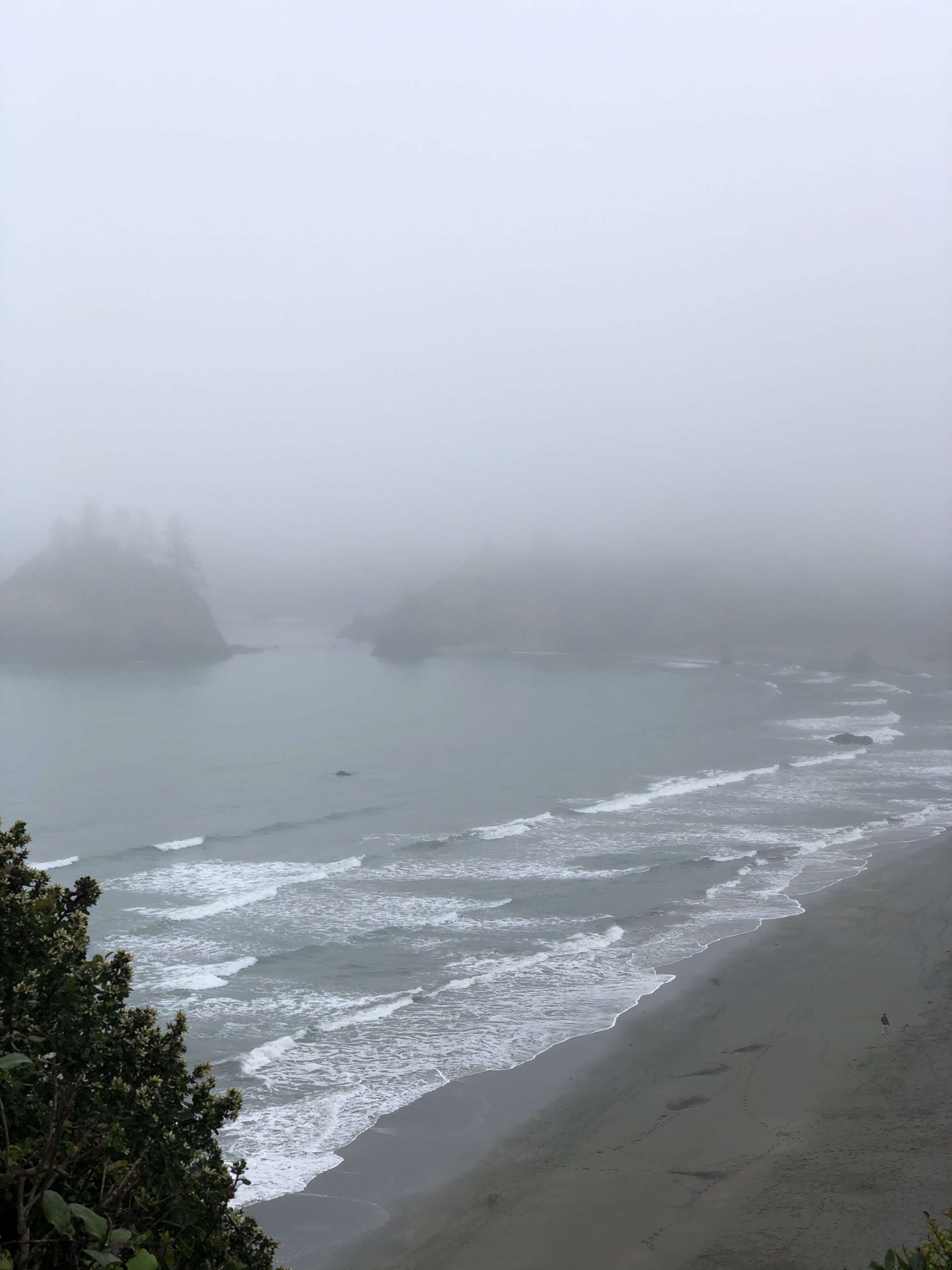 After a very busy weekend Trinidad returned to its sleepy self and was quiet this morning. Trinidad State Beach was packed this past weekend because of the amazing weather we experienced. It seems like half the county flocked to the beach. Unlike the weekend, a wet fog rolled in and blocked the sun this morning. Today feels like Fall and nothing empties a beach and headland better than a little fog. It’s quite amusing actually and definitely sets the morning mood, often slowing folks down and bringing solitude to us regulars.