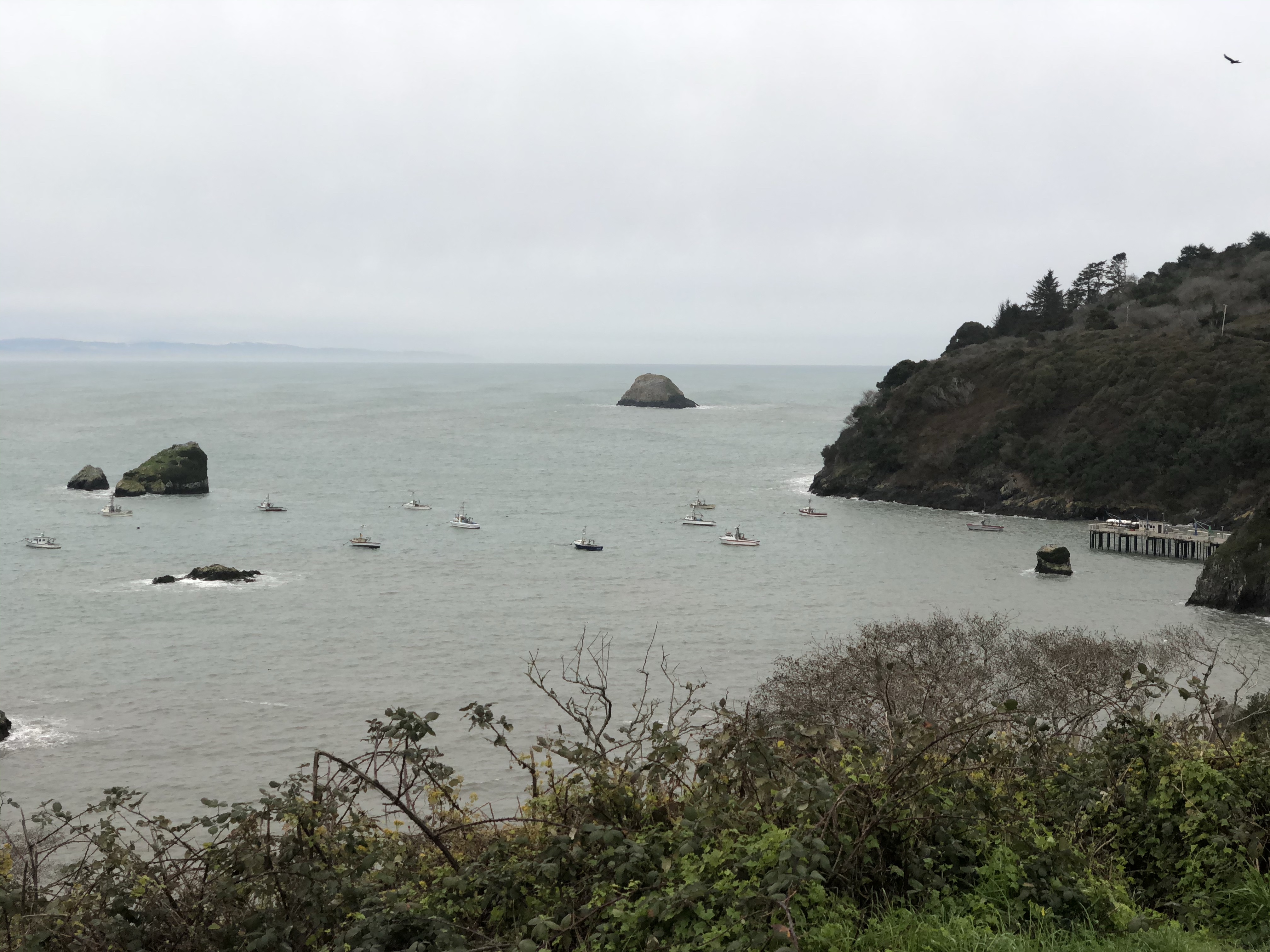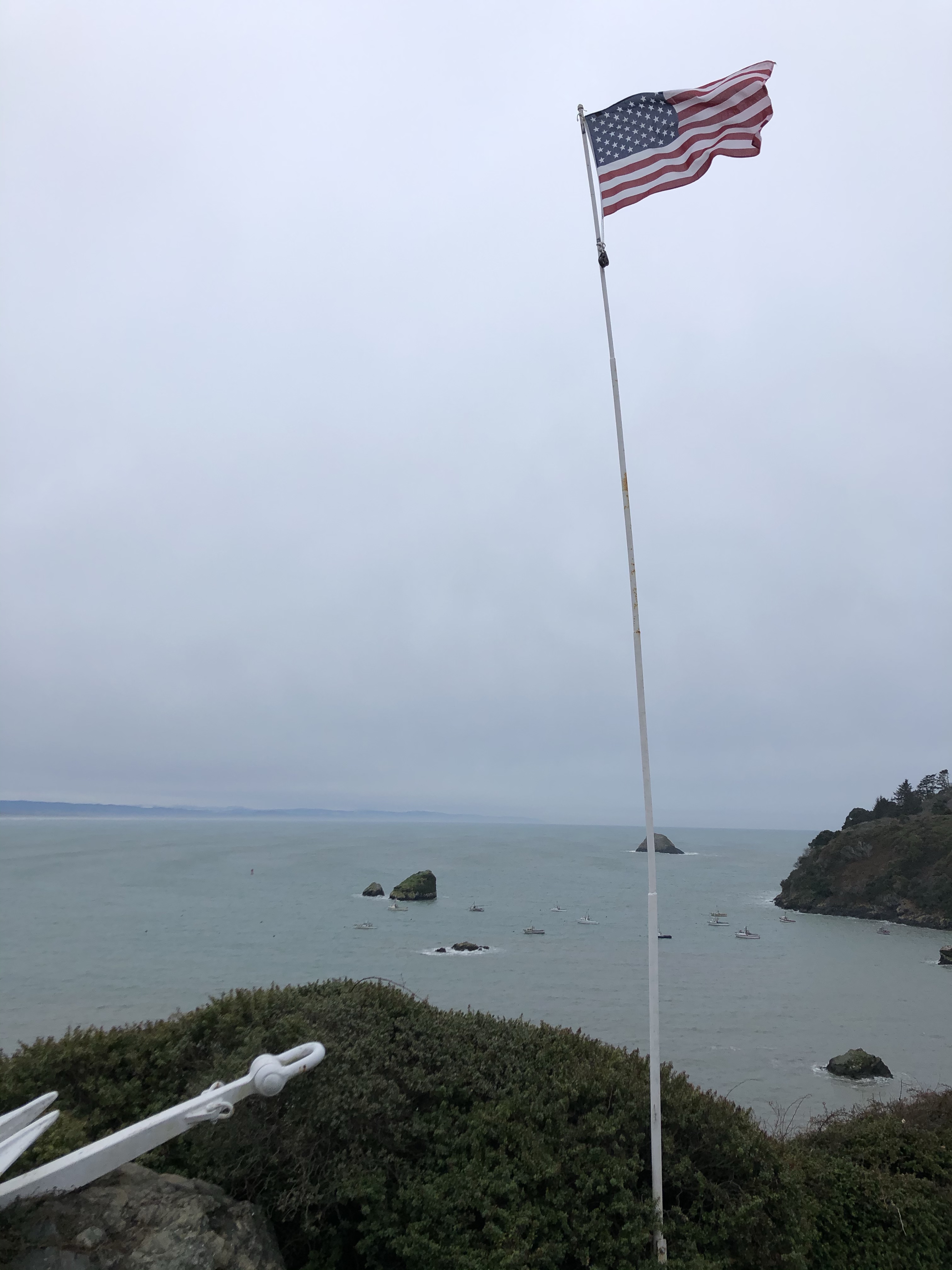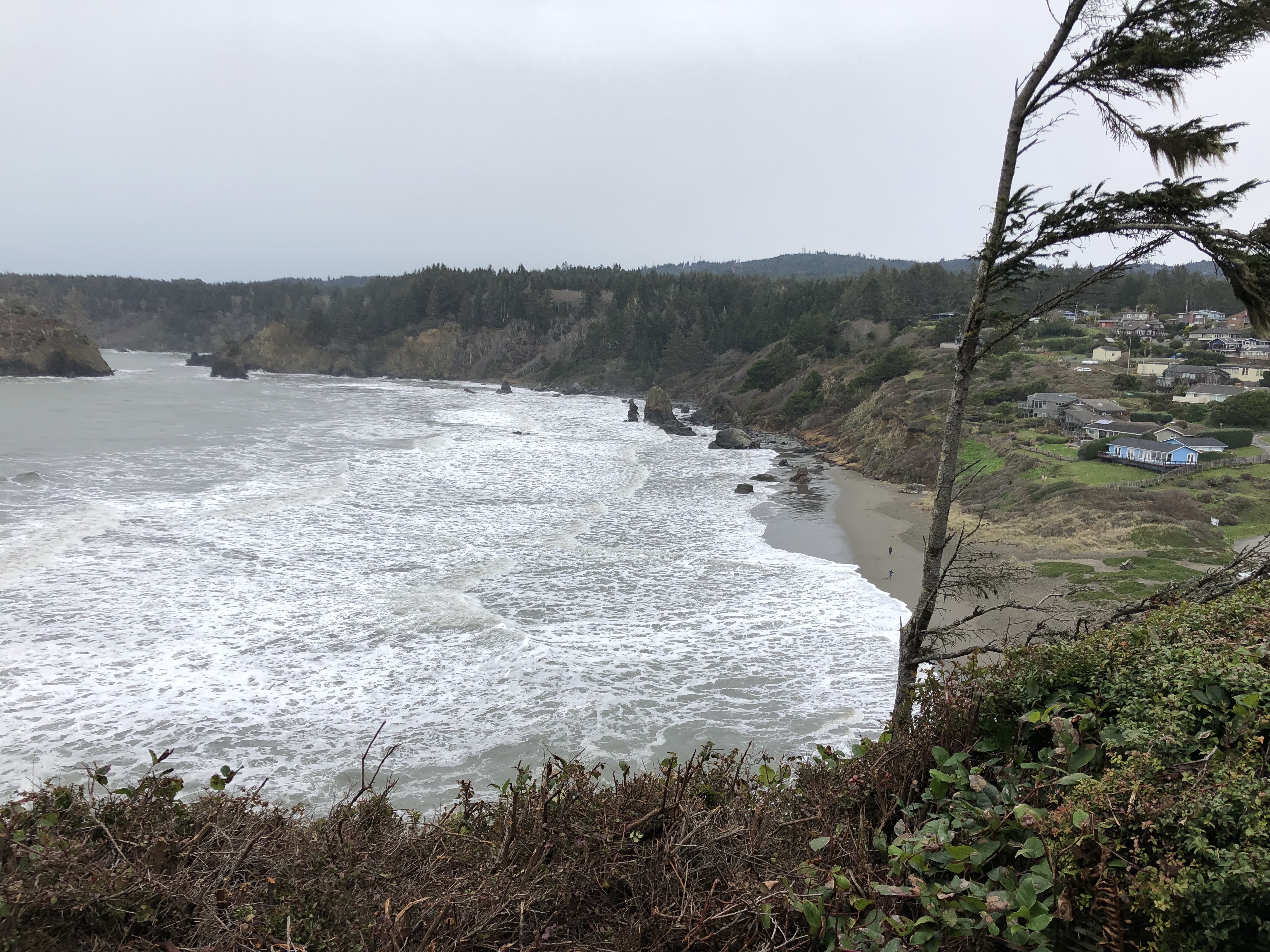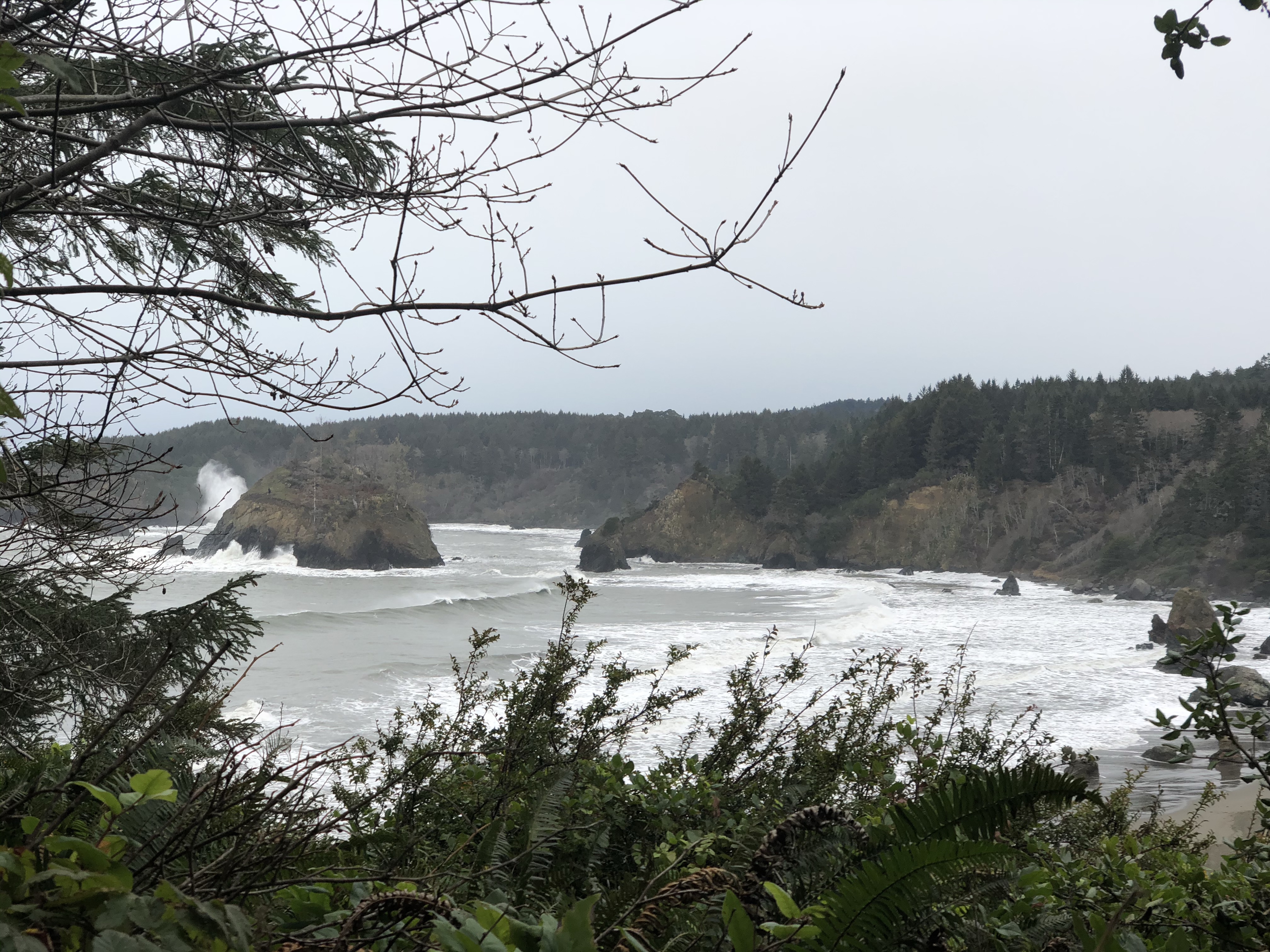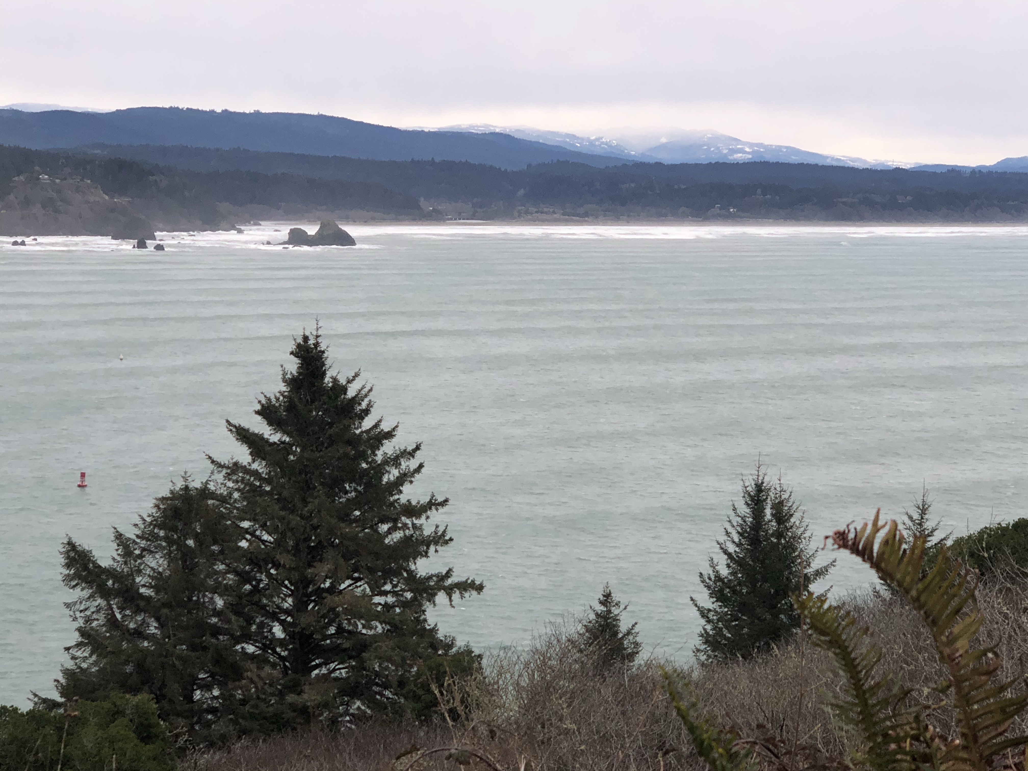 Baxter and I took our walk in some very blustery weather this morning. There’s a big storm predicted for our region and the ocean bears testimony that it’s well on its way. The waves were big, the tide was high and the wind was blowing hard. Not a day for a walk on the beach. But as the US Coast Guard well knows, people don’t think and don’t heed warnings because they are curious about storms. Looking down on Trinidad State Beach from the top of the headland (while shaking my head) I watched three people who were hanging out on the beach run for safety from the fast approaching surf. Not the smartest thing to be doing in a storm like this.