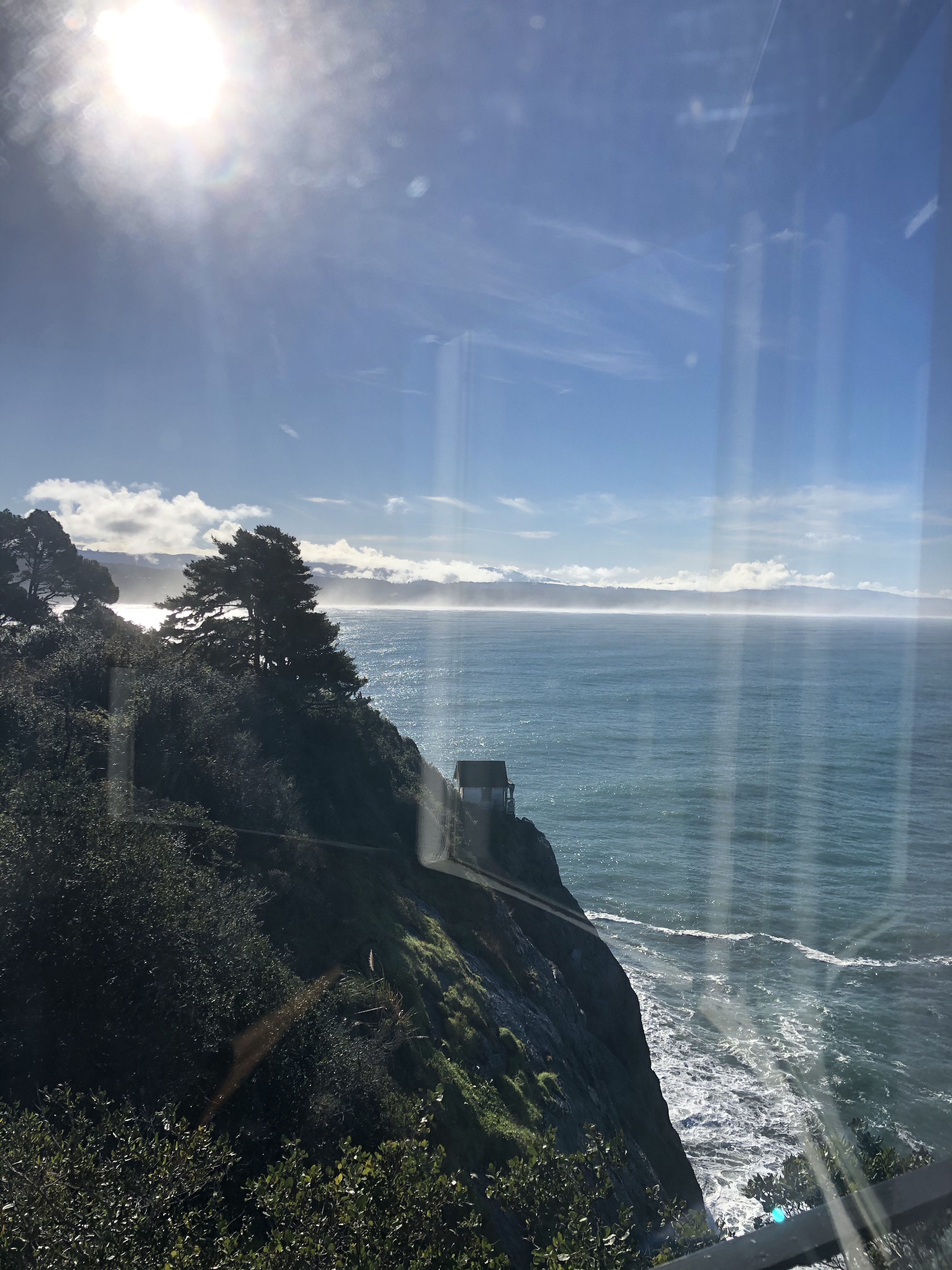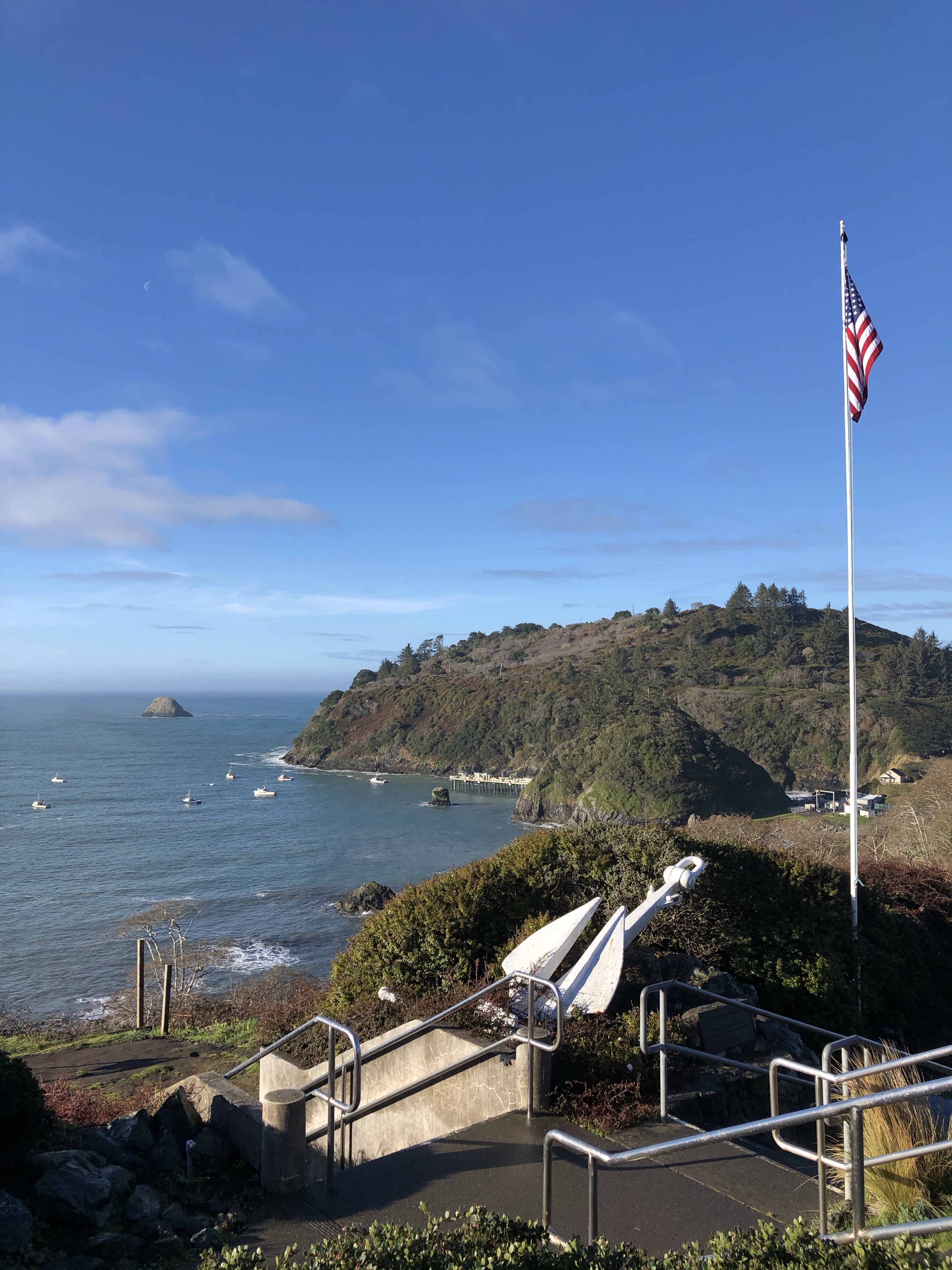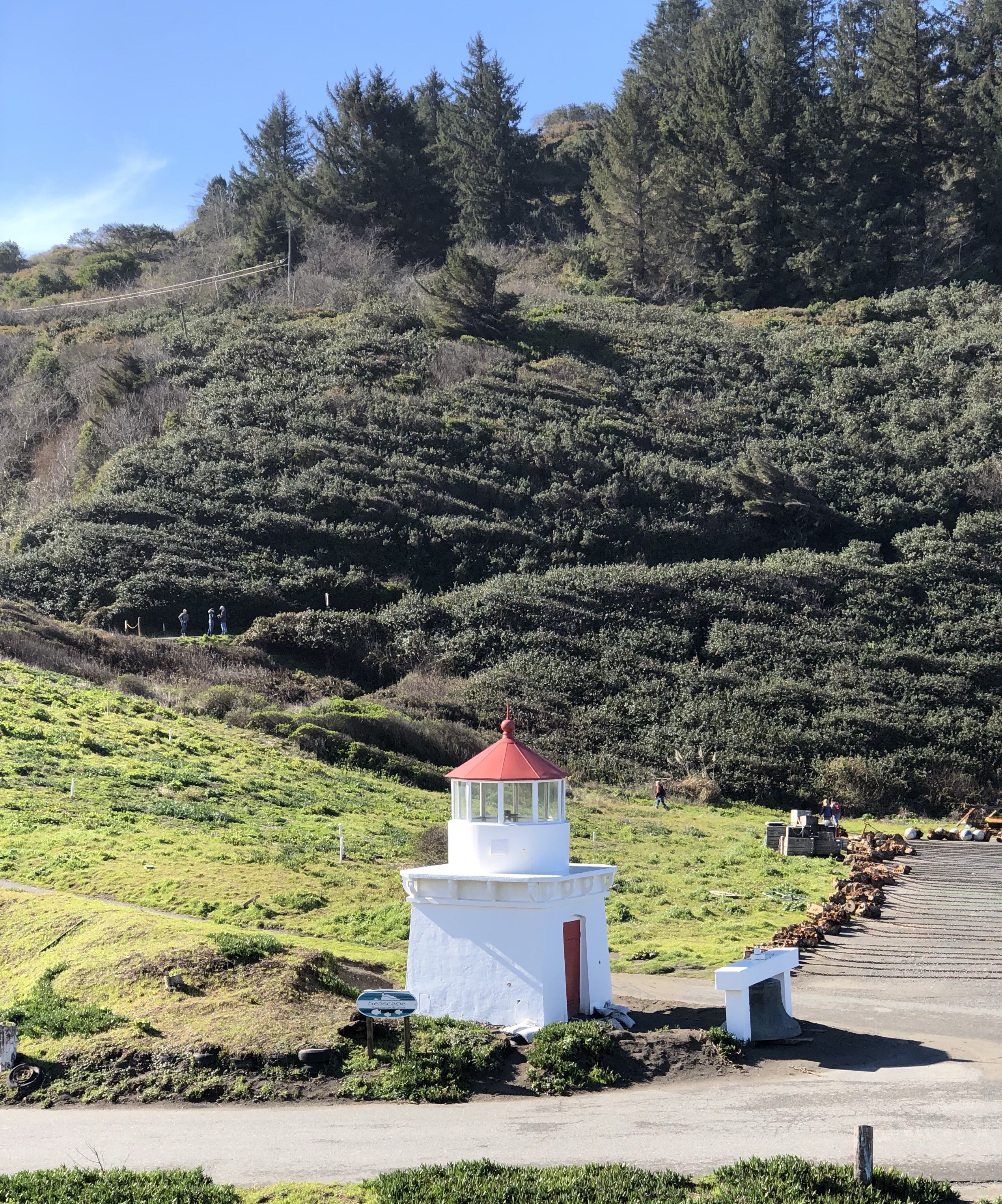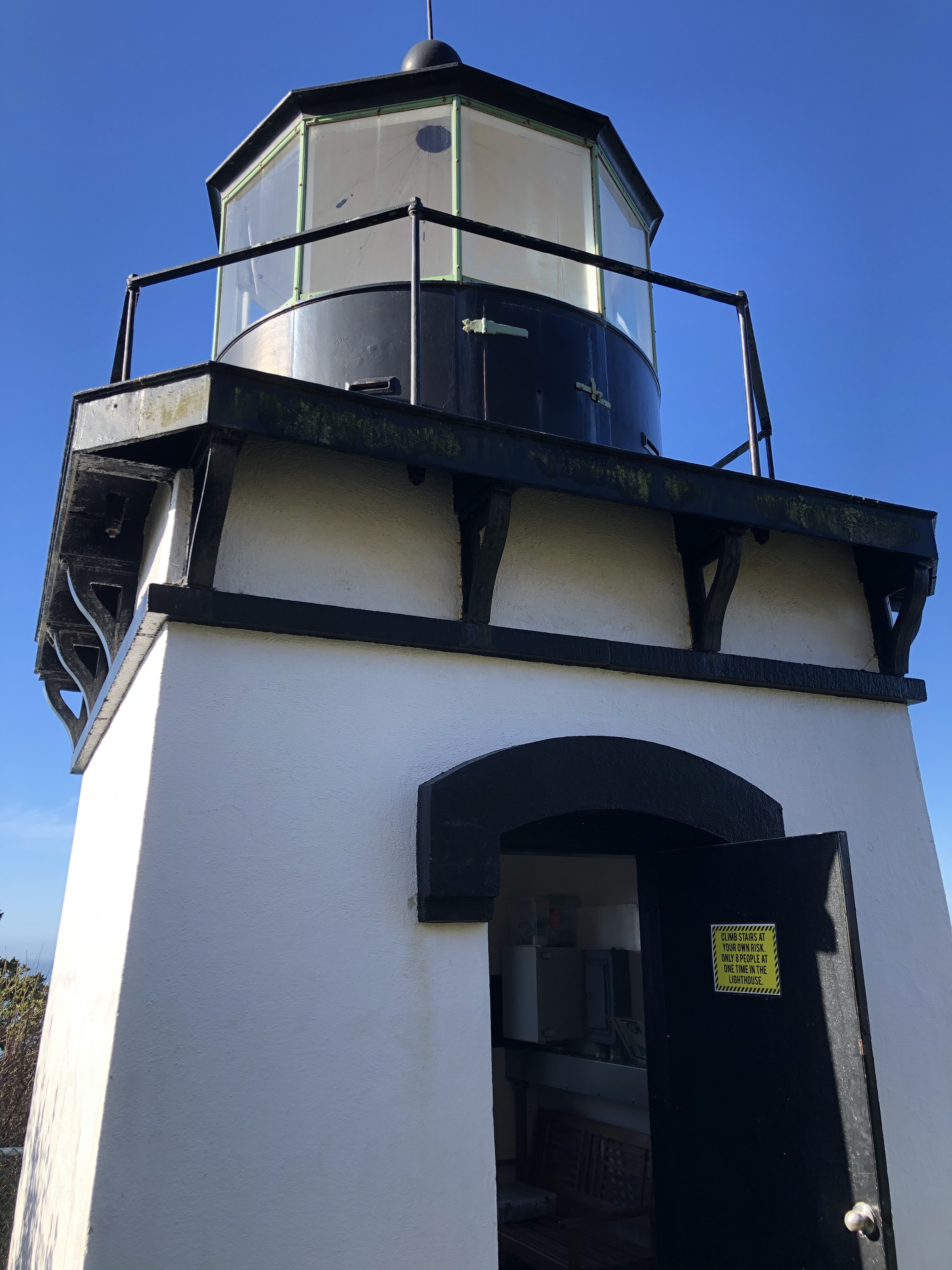 It’s the first Saturday of the month so the historic lighthouse was open. There are two lighthouses in Trinidad. Both are on the headland. The Memorial Lighthouse (replica) which the Trinidad Garden Club built in 1949 is currently at the base of the headland next to the state beach parking lot. On the south side of Trinidad Head is the actual lighthouse that used to be staffed by a lighthouse keeper and later Coastguard personnel. The working lighthouse originally had a fourth-order Fresnel lens and began service on December 1, 1871. Today the lighthouse function is automated. The lighthouse and the bell house remain onsite; the lighthouse keepers home no longer stands. Volunteers from the Trinidad Museum donate their time to open the site from 10 am – 2 pm once a month.