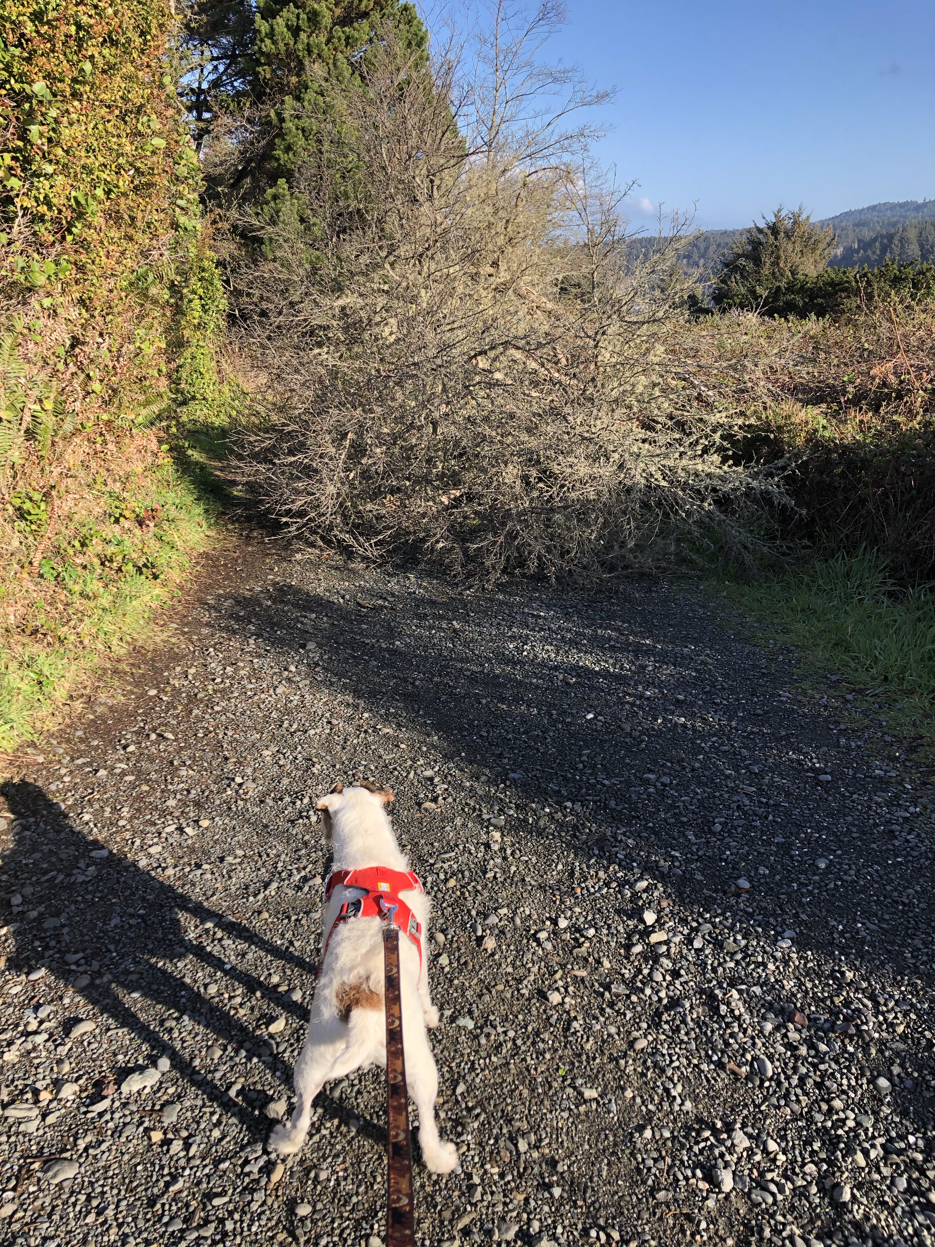 We had some serious wind last night that to a lesser extent continues today. As a result a tree was down on the headland loop. Baxter and I skirted by the tree on foot but a motorized vehicle would be blocked. My neighbor saw us return and the response I got was, “you walked in this?” I’ll admit, it is windy and cold; 45 degrees and 19 mph wind. The worst of it is the windchill which makes the temperature feel colder. Otherwise it’s a gorgeous day.