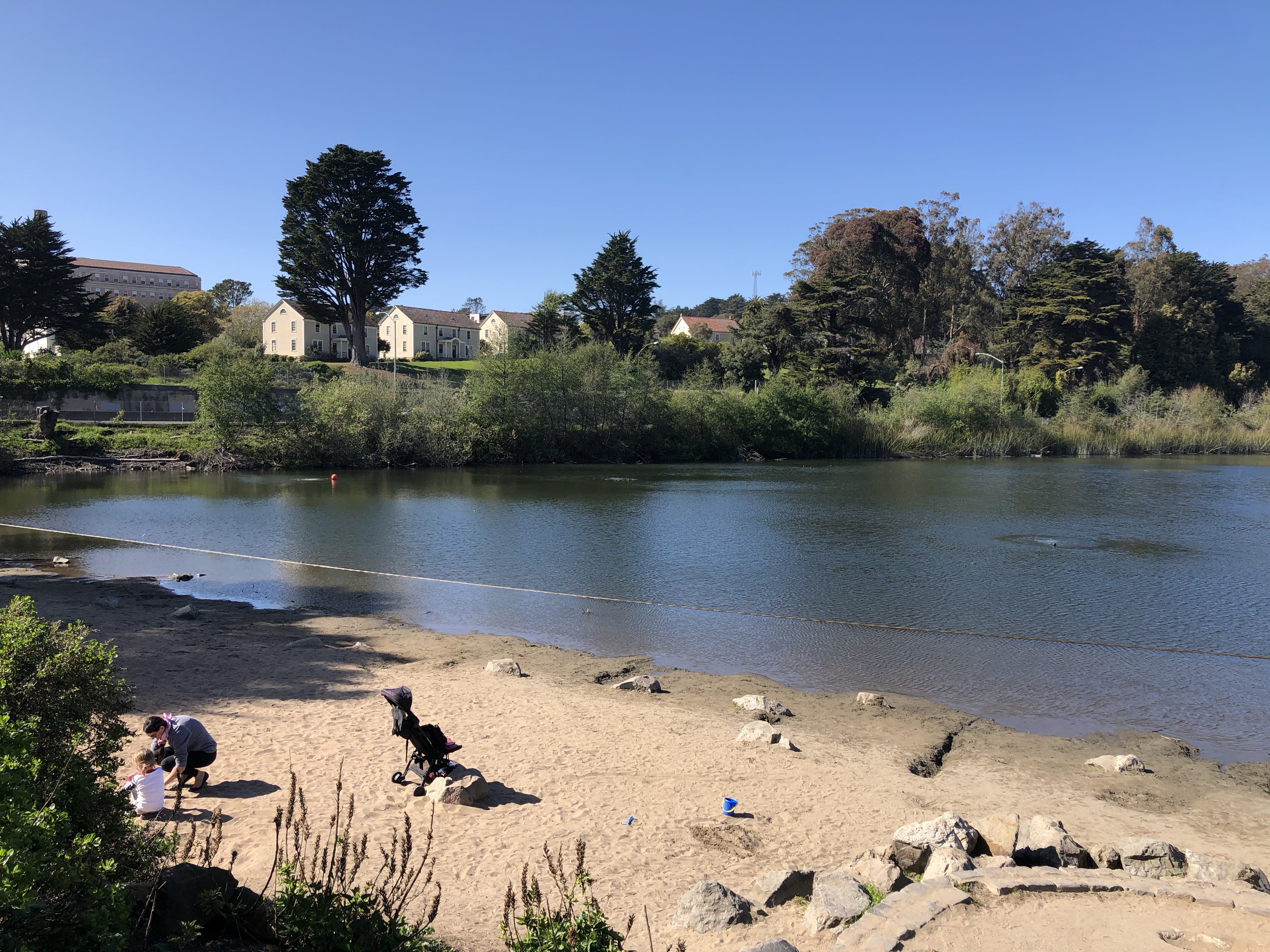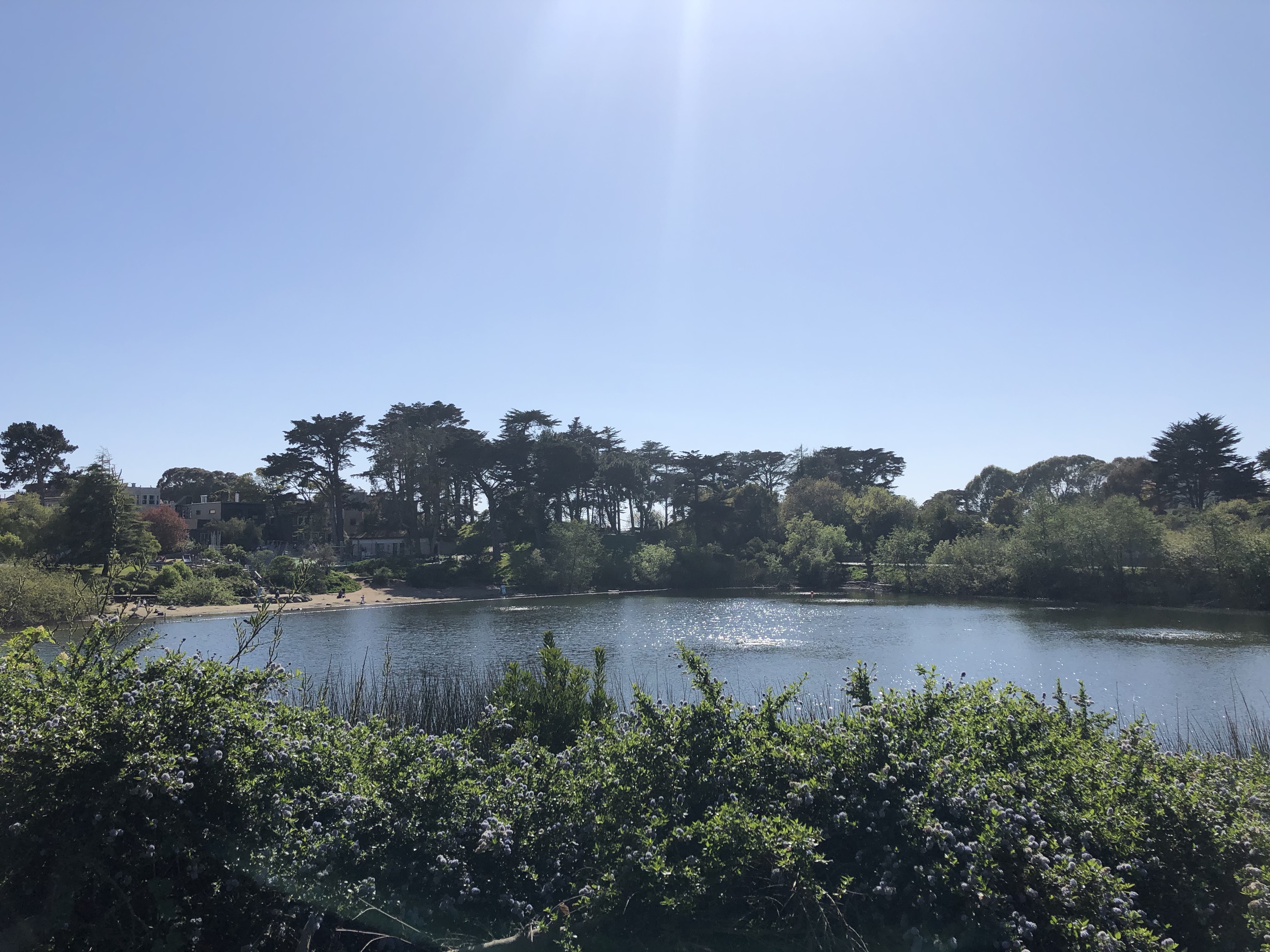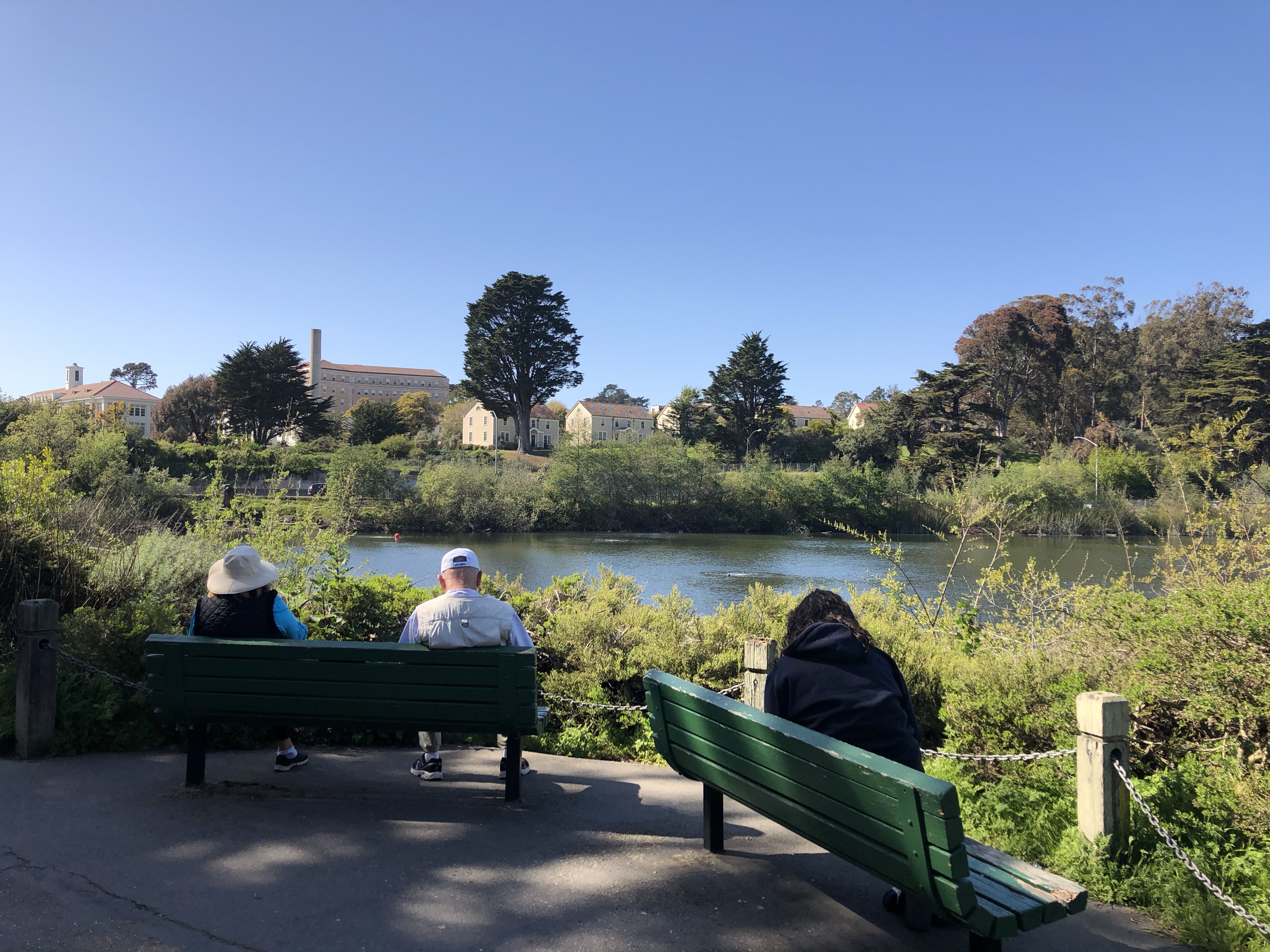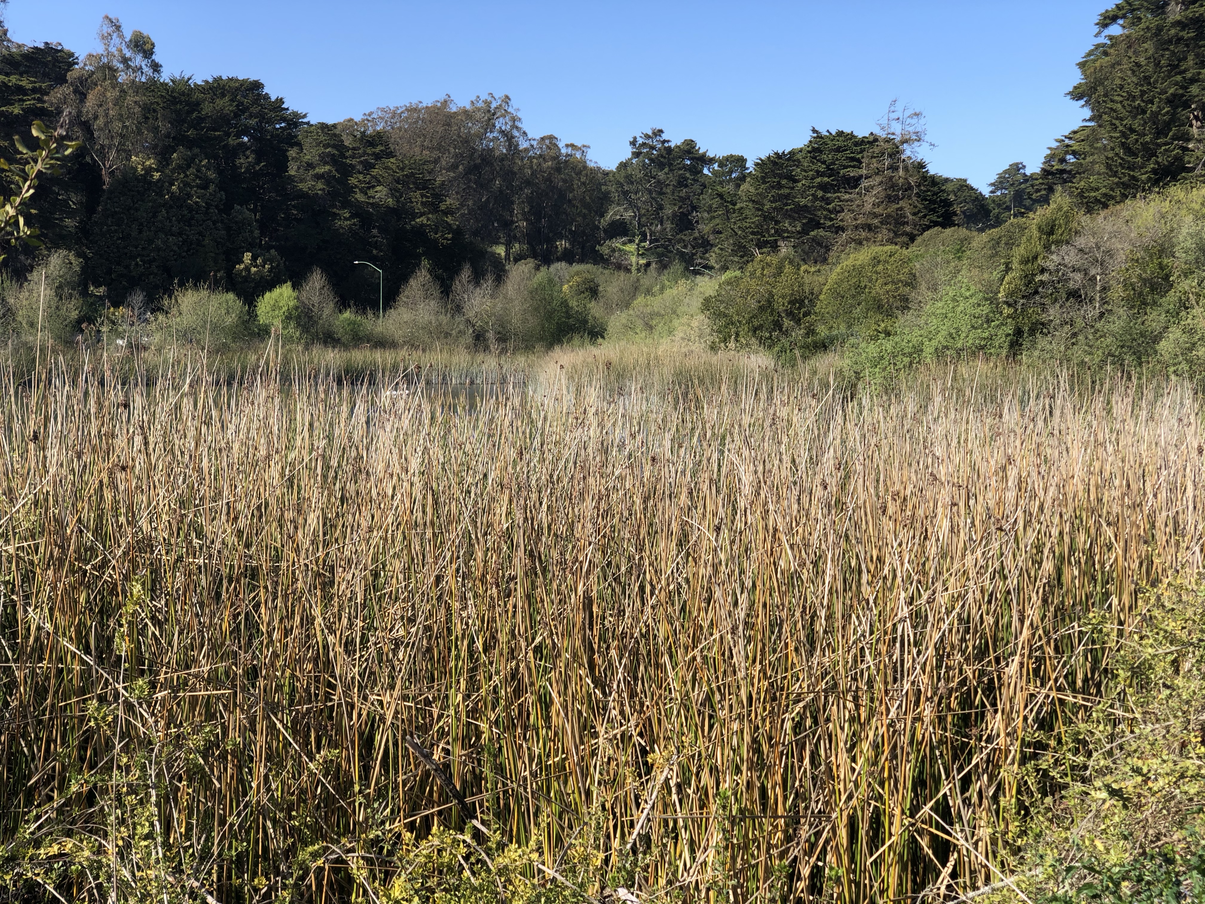 With determination we persevered on foot and found Mountain Lake. If your in a hurry, it’s actually quicker to get to the lake via car, bus, or bicycle and the Mountain Lake Park Playground in the Richmond District. According to park signage, the lake is one of San Francisco’s last remaining natural lakes. It’s not a large lake but is a charming site adjacent to Mountain Lake Park. It’s a lovely picnic spot that has a lot of history. The Ohlone were its first residents and you can see the tule that was used in basketry and mat making growing along one side of the lake.