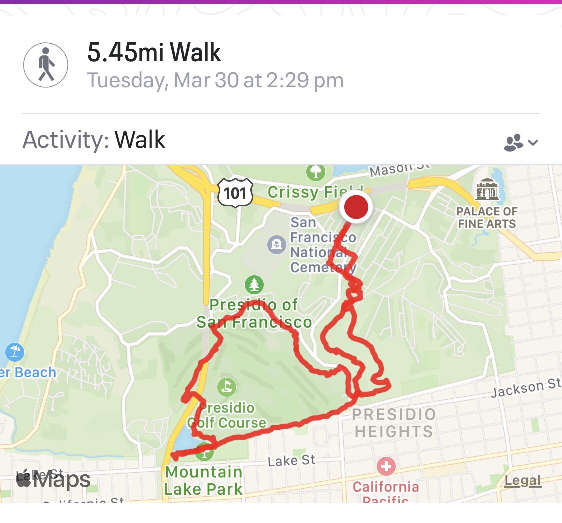 I’ll admit that I can be stubborn. Today’s walk was an illustration of that character trait. My daughter and I were determined to find the elusive Mountain Lake while walking the trail system at the San Francisco Presidio this afternoon. It is not as easy as it sounds. What started out as a short walk in the woods became a 5.45 mile trek.