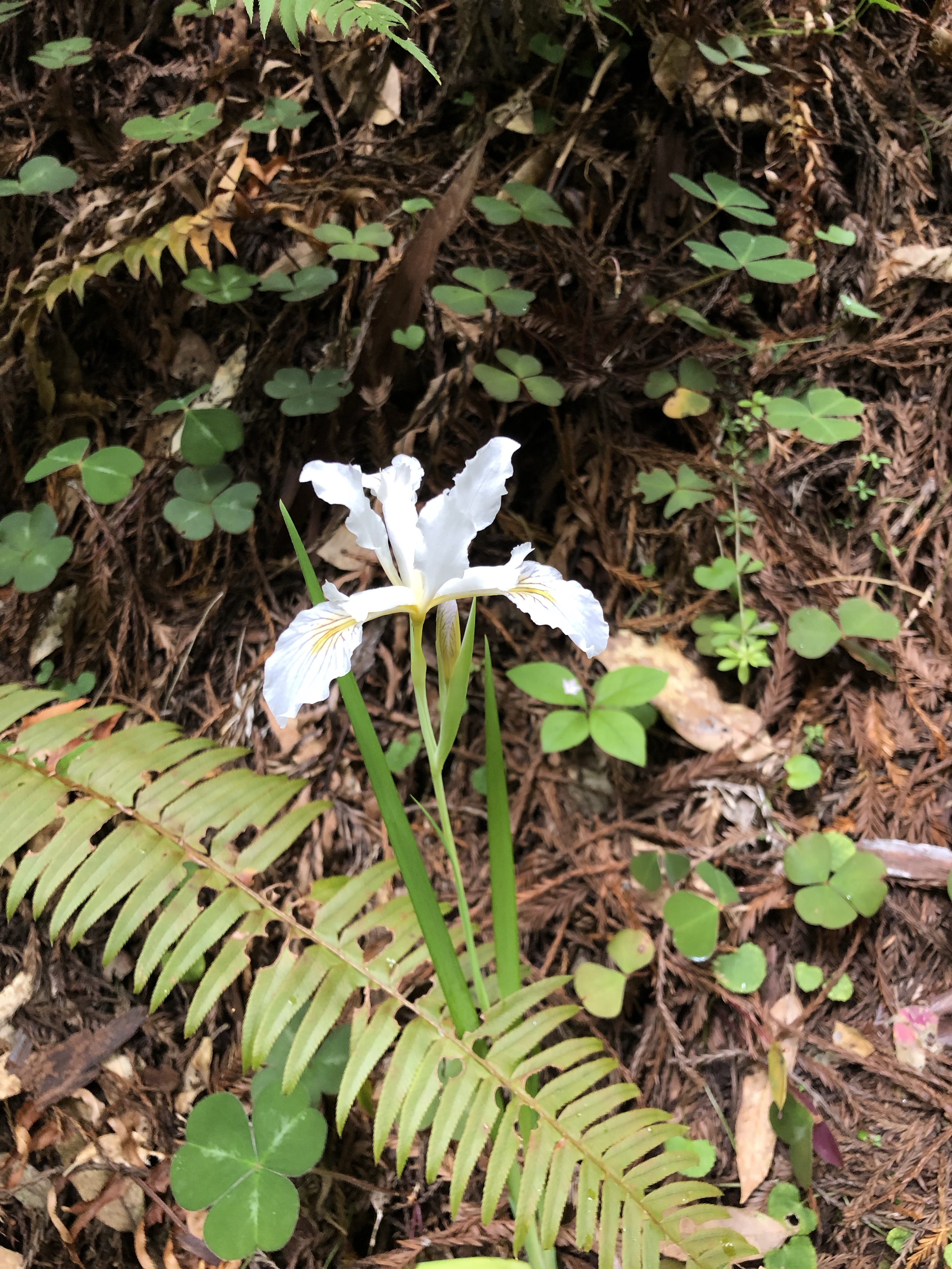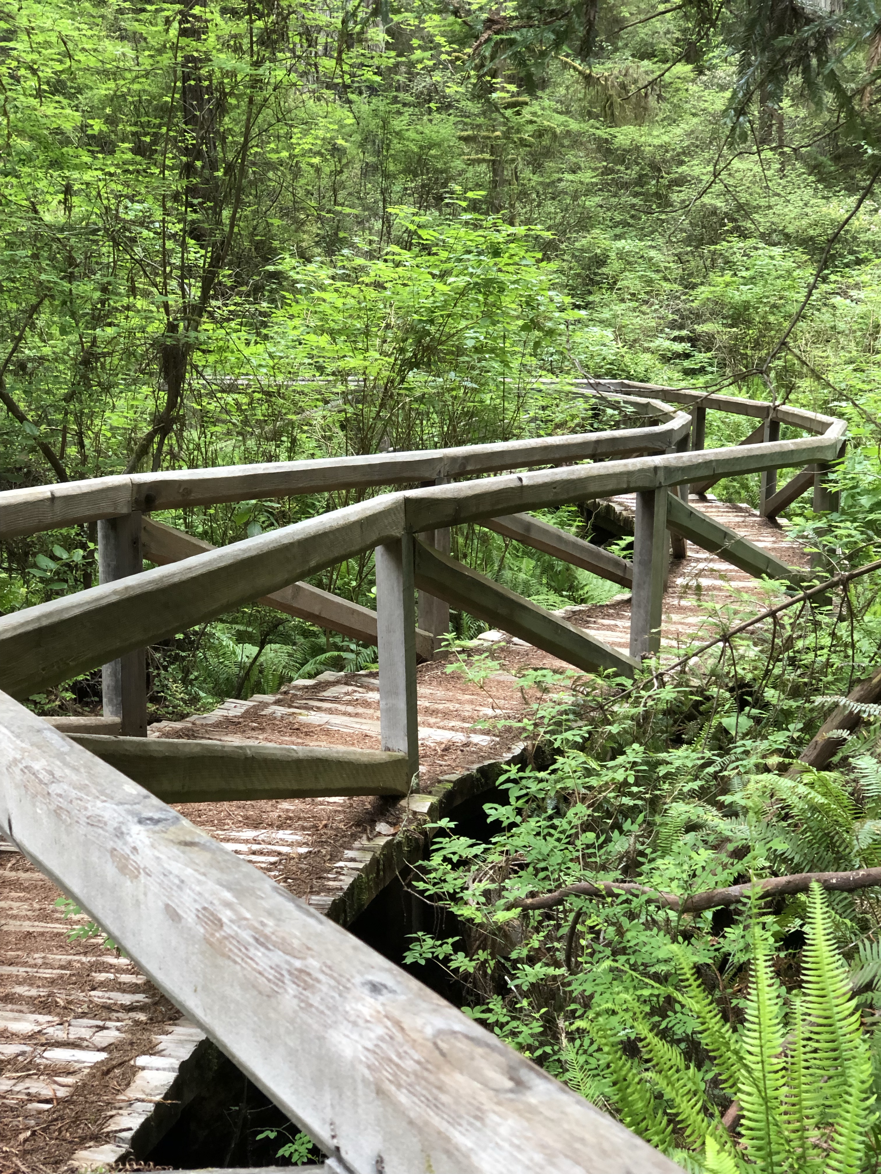 This is a gorgeous forested trail that goes up about 600 feet in elevation. A 3.7 mile route with a nice elevation spike to get your blood pumping, but not too difficult. We came across old growth redwood, spruce and fir trees surrounded by a wide variety of ferns and blooming native plants. The trail was lined with a carpet of spent trillium so I’m definitely planning to return next spring to see them in their peak. A fall hike would probably include an awesome mushroom display.
