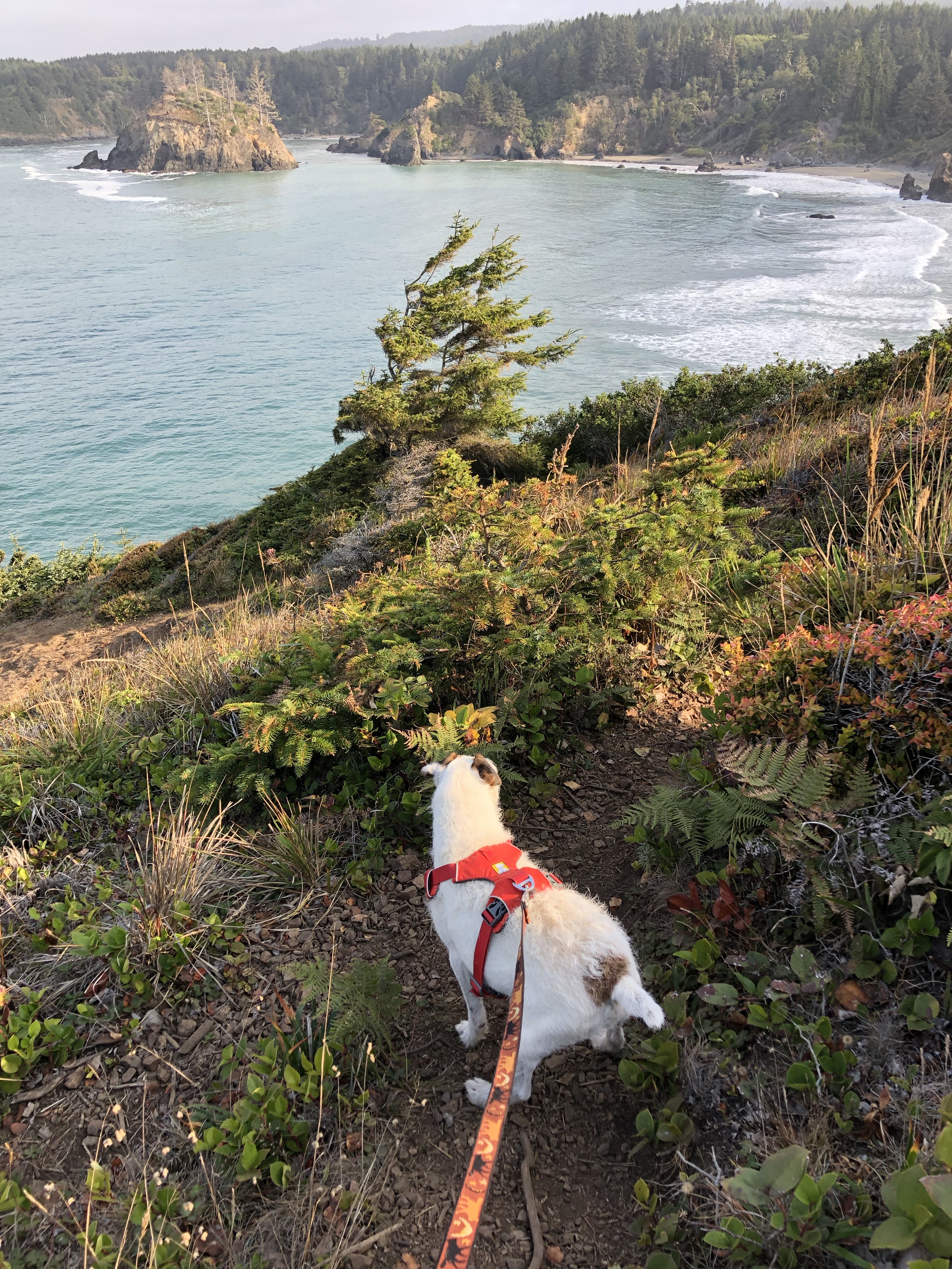A peaceful end to the week and start of the weekend, not another soul on the trail. With the exception of a SUP boarder on the Bay and one couple on State Beach, it was just Baxter, me, some peeping oyster catchers and a couple of spouting whales this morning on Trinidad Head. It’s a glorious Friday. With the sun on my face and the trail to ourselves, what more could a girl ask for?