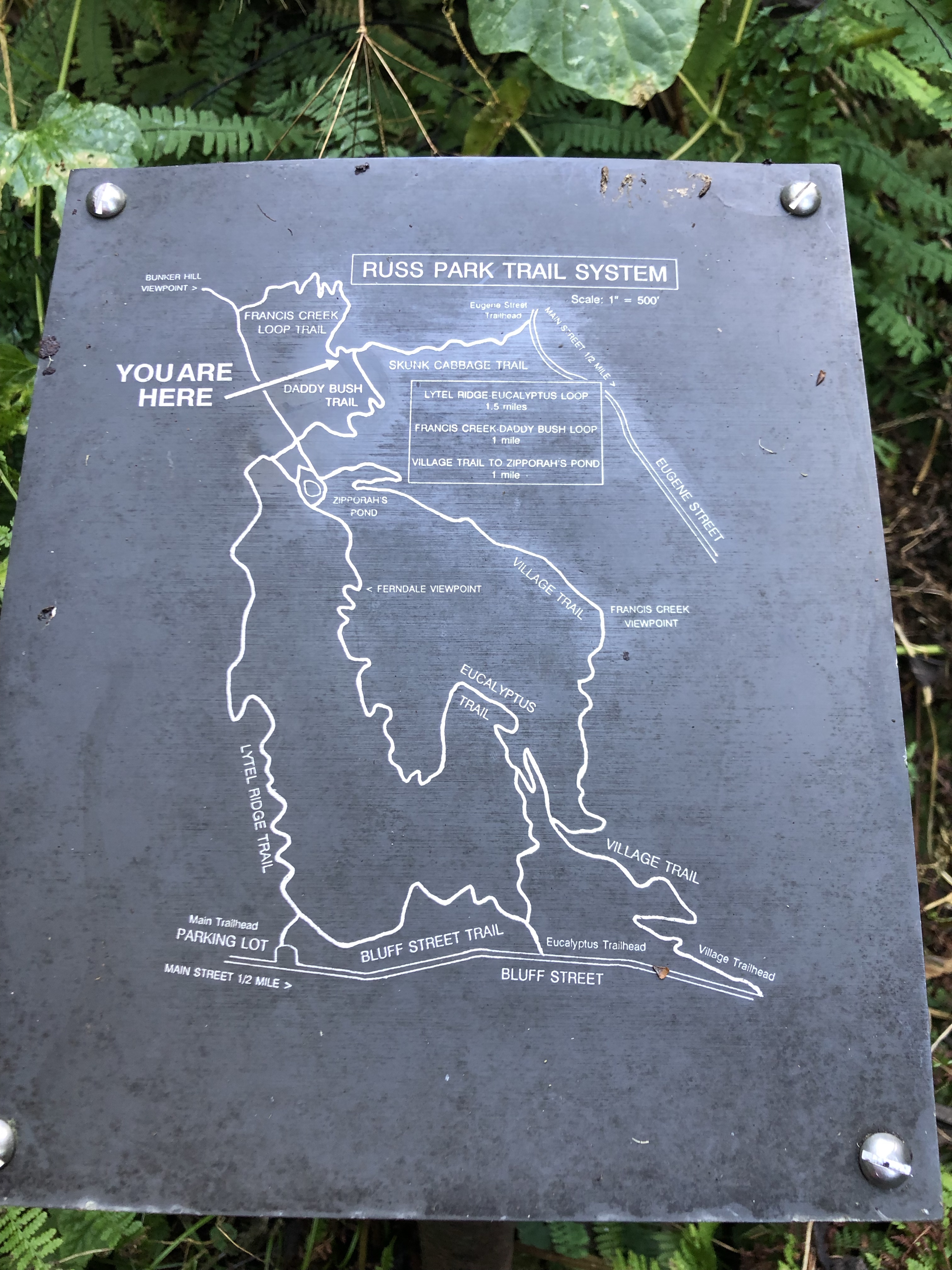 One of the cool logistical things about Russ Park is the great trail signage. All forks in the trails are well marked with “you are here” metal maps so way finding is super easy. There is a small parking lot with a port-a potty. The trails are well maintained by a dedicated group of volunteers who work in partnership with the city. The local community obviously takes great pride in maintaining the site and it’s resources.