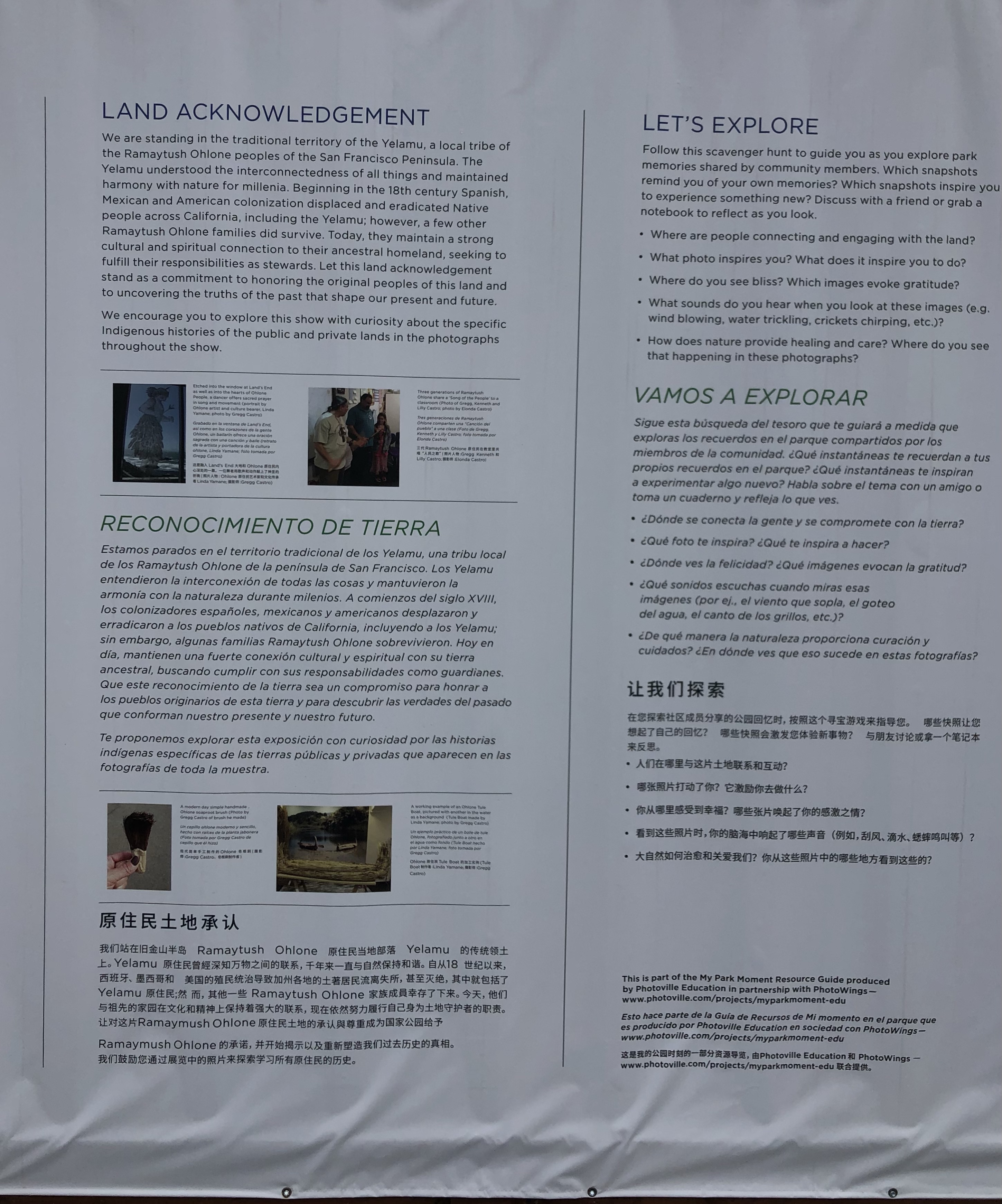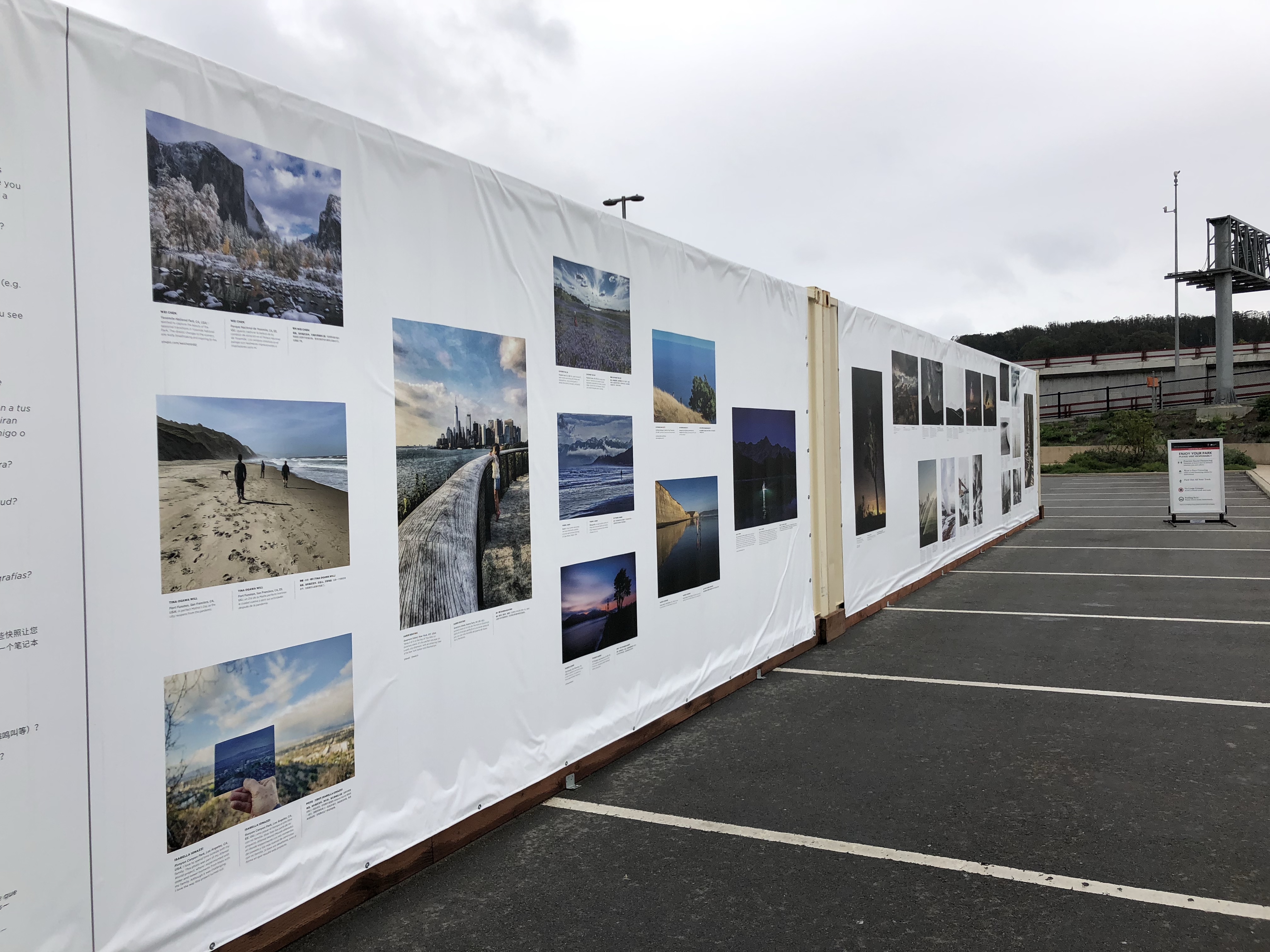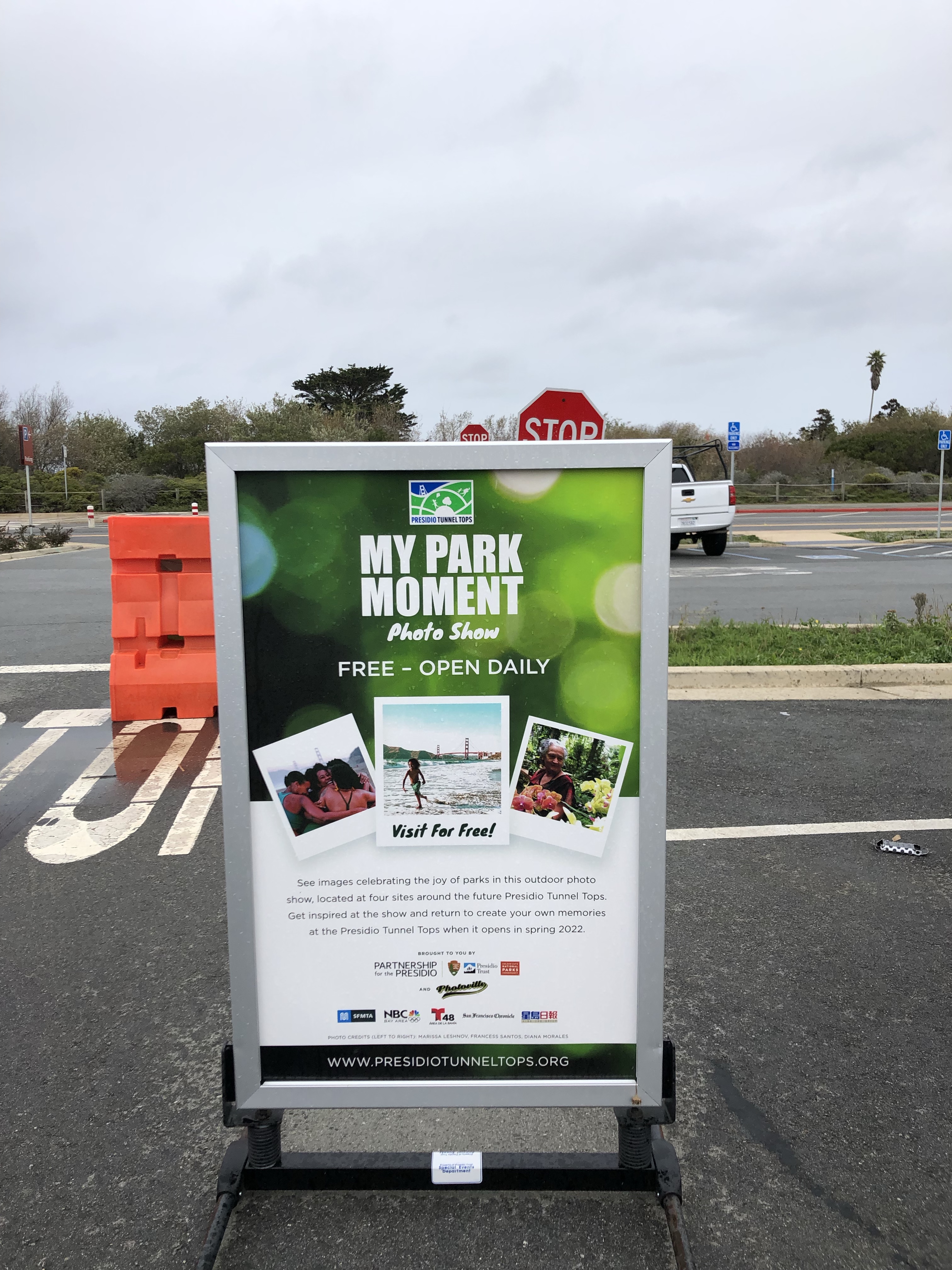 I am incredibly grateful that we have a National Park System which in San Francisco includes the Presidio, Crissy Field and Golden Gate Park. (Marin Headlands is another fabulous recreational resource just north of the GG bridge and featured in my previous blogposts.) My time on the sidelines is enhanced greatly by these public access opportunities. I can stress bust on the trails while enjoying beautiful scenery and today I also got the opportunity to enjoy some public art. The My Park Moment program is a temporary photography installation at four sites at the Presidio. I’ve added some pics below from the installation at Crissy Field.