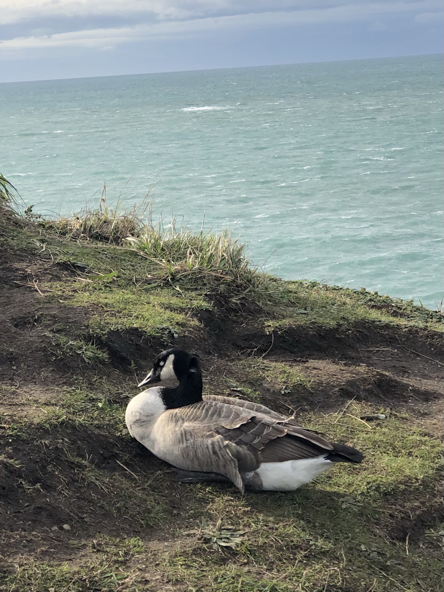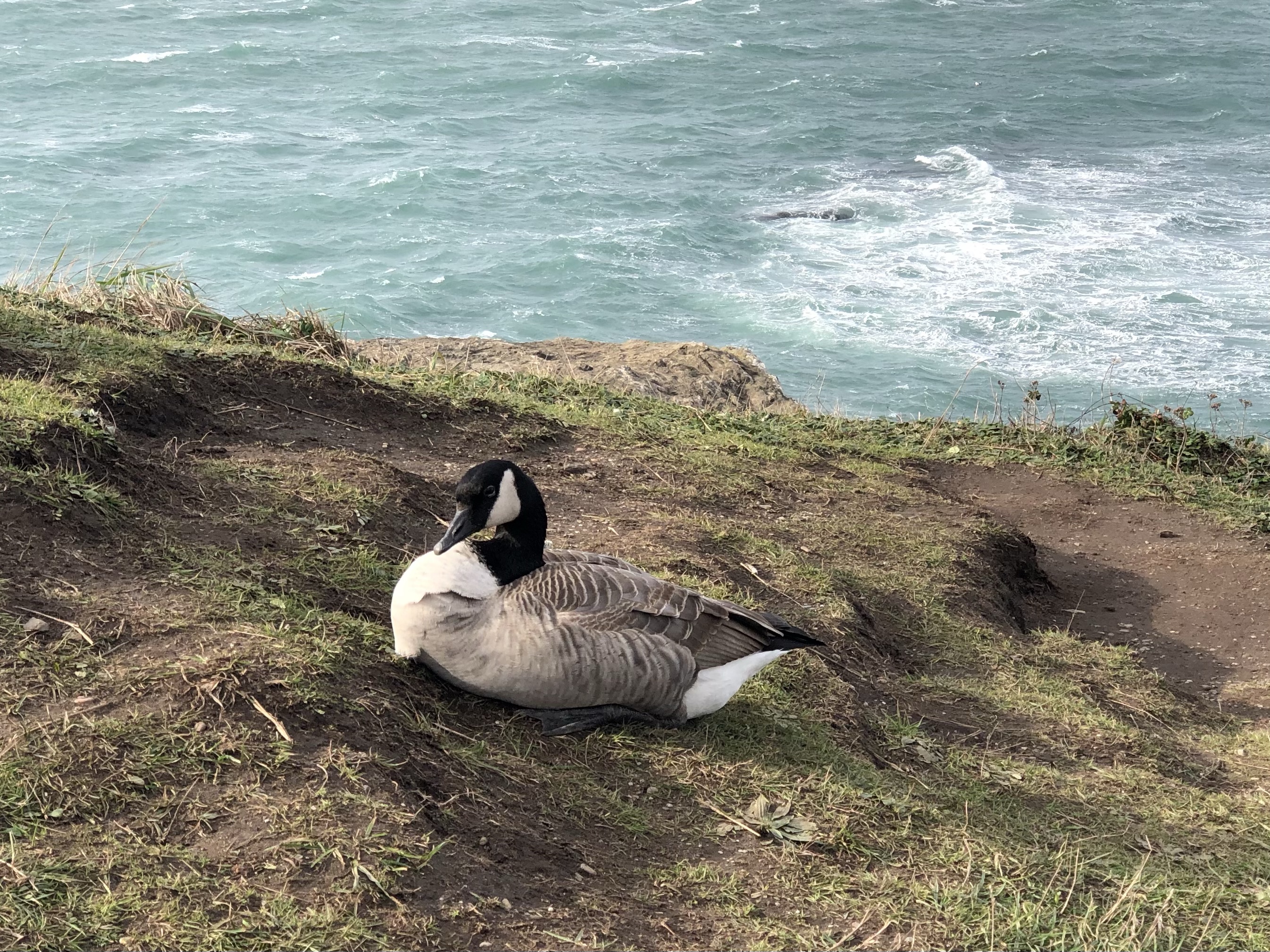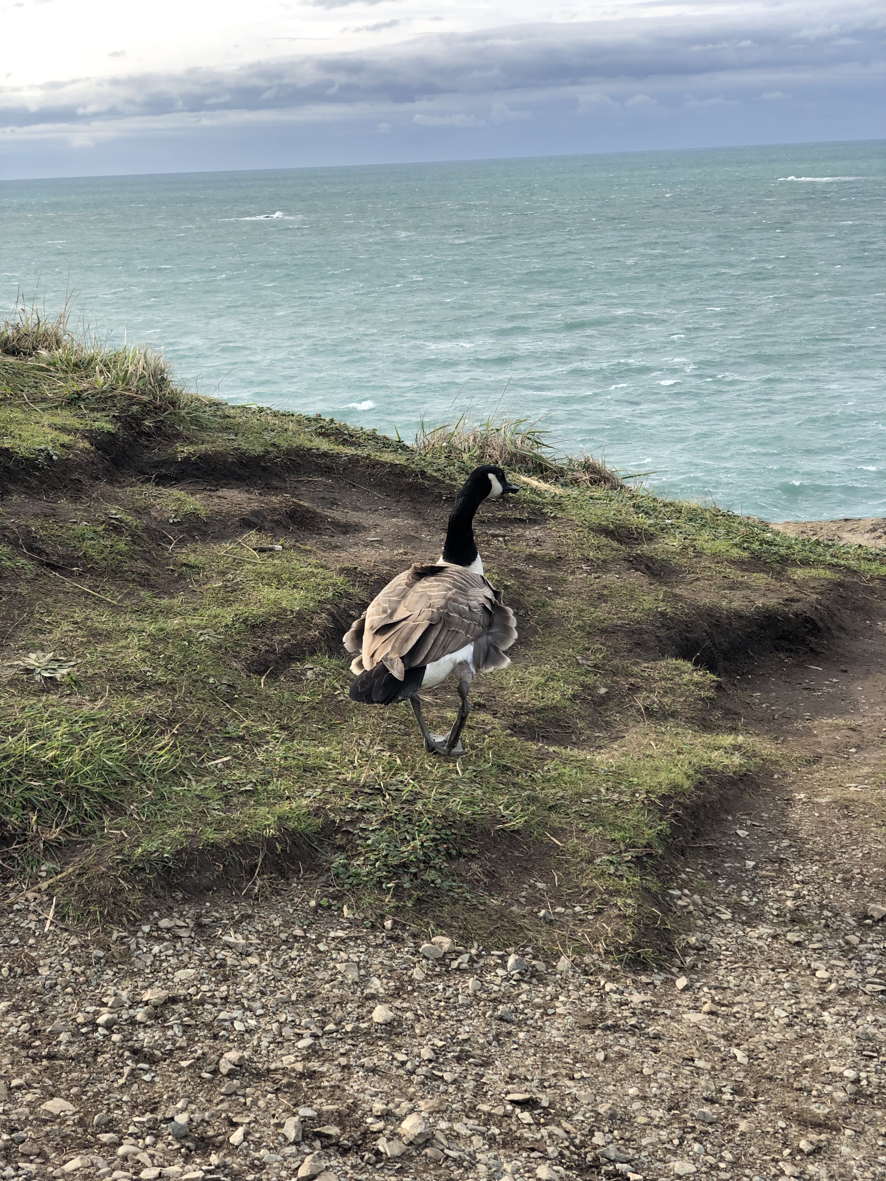 Like in the Children’s playground game, Duck, Duck, Goose where a tap on the head means your it, my walking partner and I were almost tagged, literally. To our surprise as we stood talking, leaning against the rail in the wind, an actual Canada Goose came barreling in like it was doing the tagging. I had just put my phone in my pocket, when I looked up to see a wobbly Canada Goose, flying feet first toward my head. The wind had picked up to 24 mph and I guess the bird got tired. Kind of a wild ride I’d say.