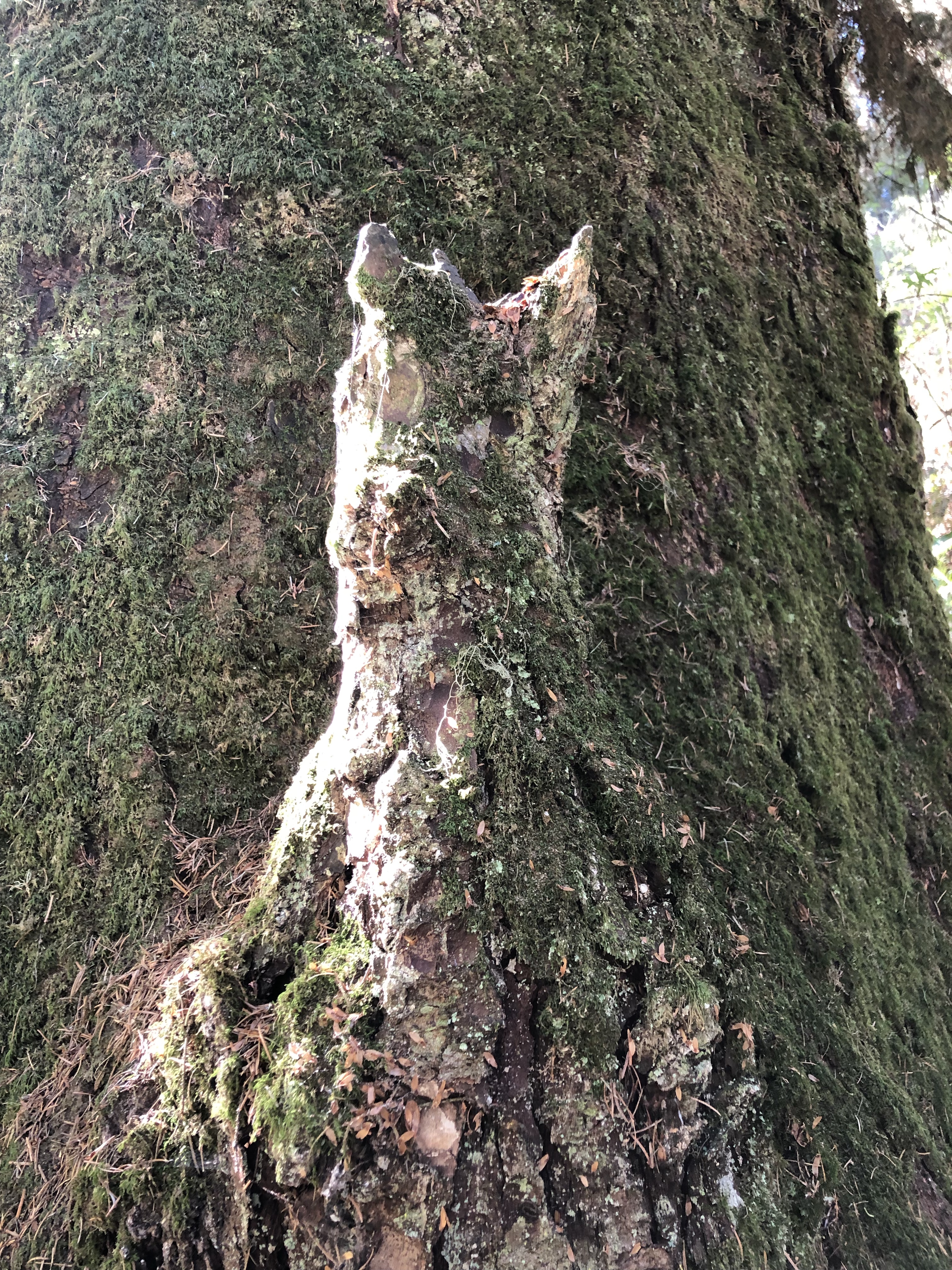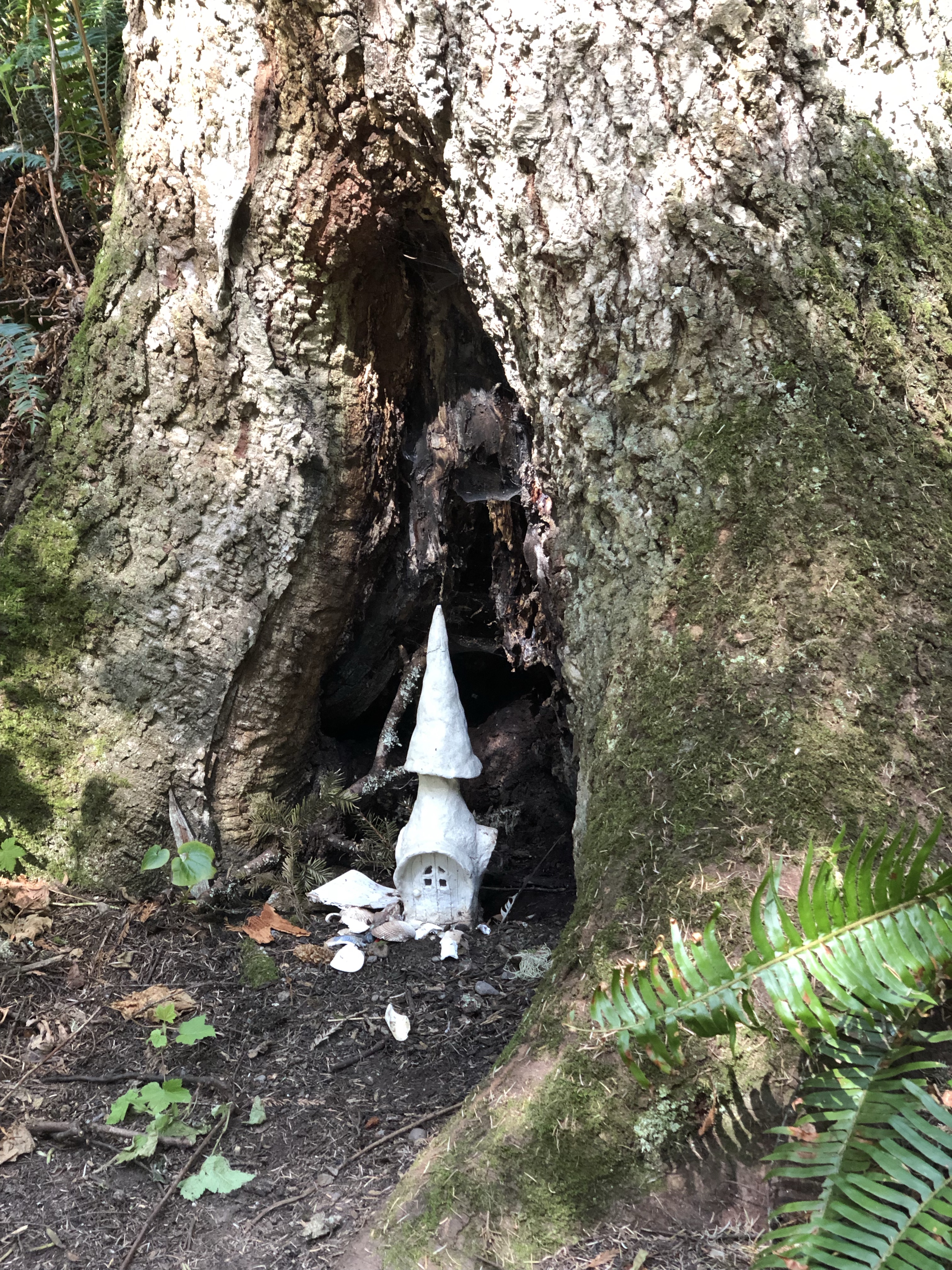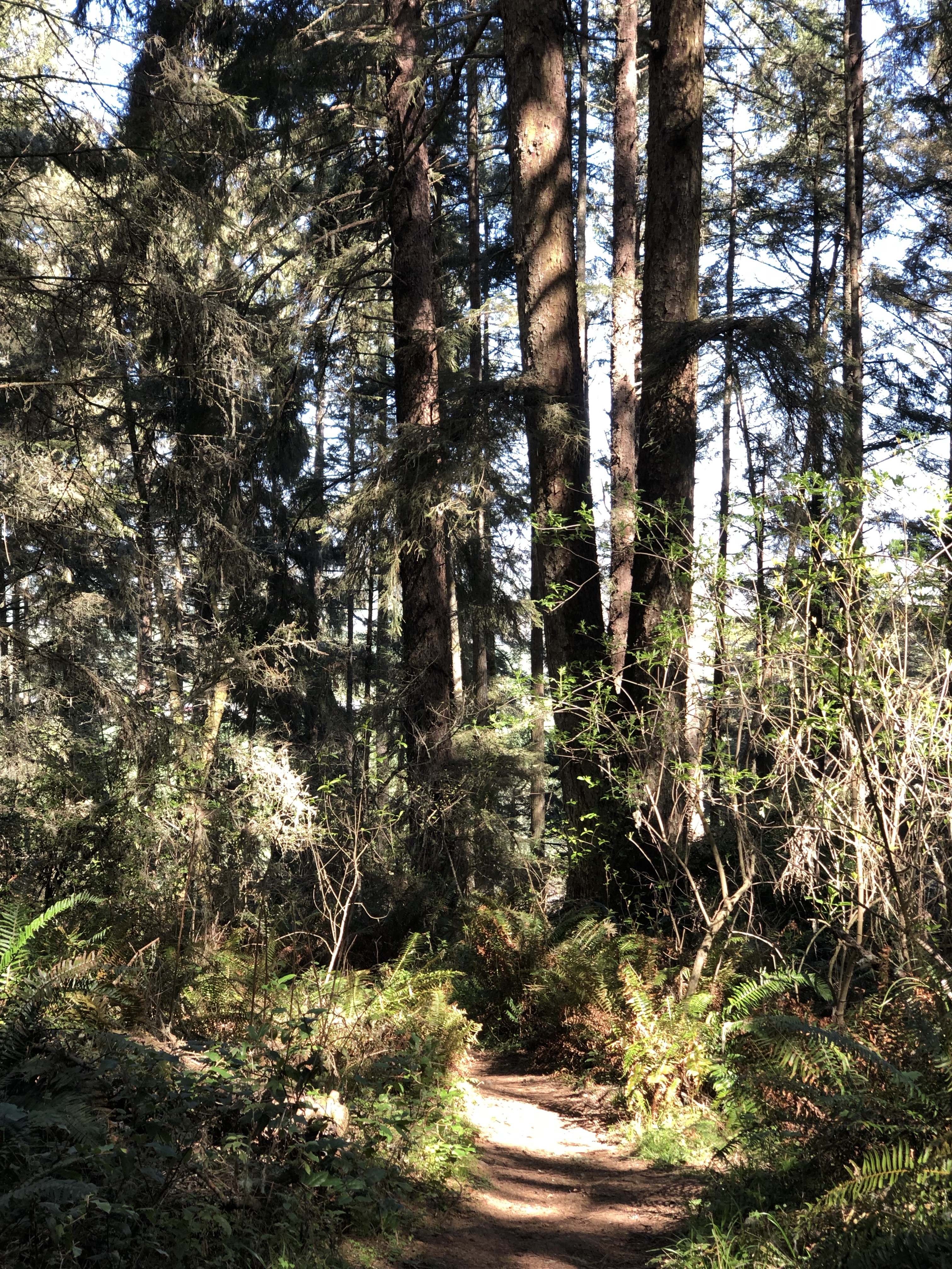 My friend Katrina joined me on today’s walk. This was only my second trip to Russ Park; Katrina’s first. Even though the trails are well marked with “you are here” signage at most junctures, I had trouble with my internal compass. The trails are basically on a 110 acre hillside in a mature Sitka spruce forest, bordering a larger forested property and the town’s Historic Cemetery. Because the signage is so well done, a person would be hard pressed to get lost. I personally just couldn’t seem to orient myself to the four directions while at this location. Fortunately Katrina served as our navigator.